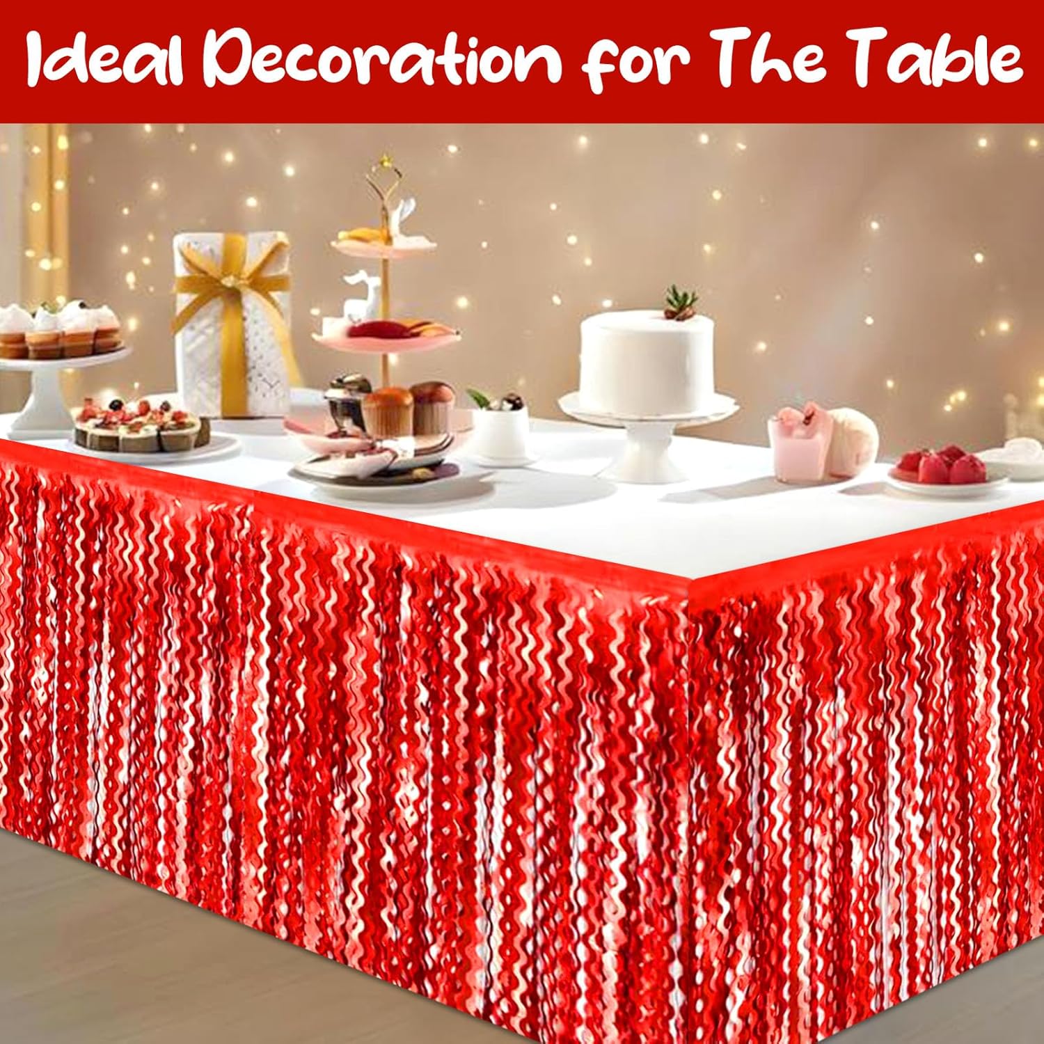6 Pack 29 x108 Inch Red Wave Foil Fringe Table Skirts Metallic Banner for Tinsel Streamer Garland Backdrop for Parade Floats, Mother's Day, Easter, Wedding, Birthday Party Decoration