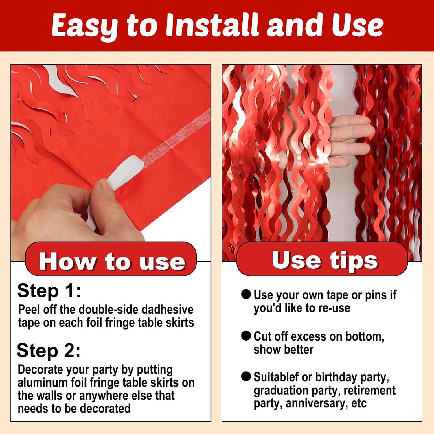 6 Pack 29x108 Inch Red Wave Foil Fringe Table Skirts Metallic Banner for Tinsel Streamer Garland Backdrop for Parade Floats Wedding, Mother's Day, Birthday Mardi Gras Party Decorations