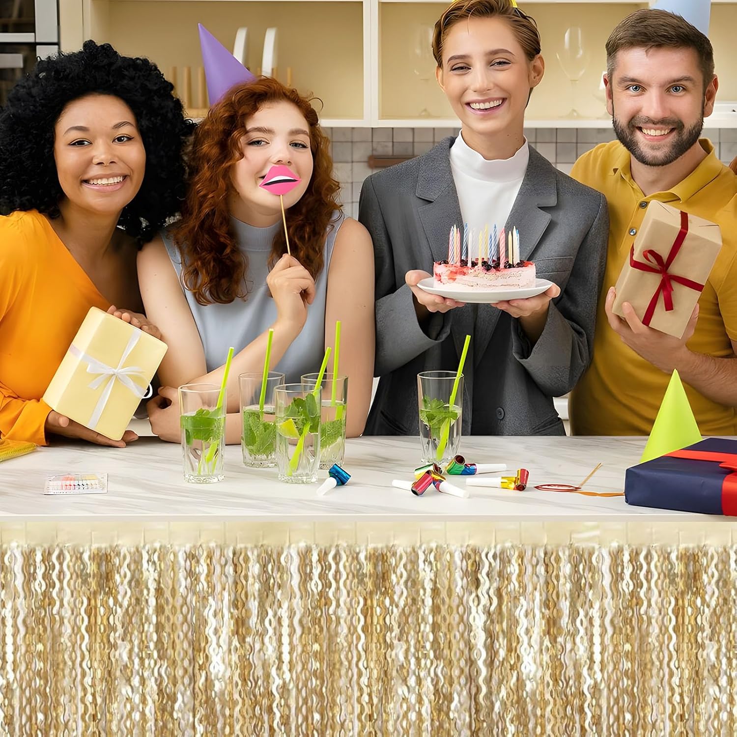 - Package Includes: 6pcs/set metallic fringe table skirts / shiny tassel banner, beautiful and shiny, provide you with great decoration effects, Each pack of table skirt measures 29x108 inches. Each one will be 9 Ft long, 6 pack will cover 54 FT length of tables.