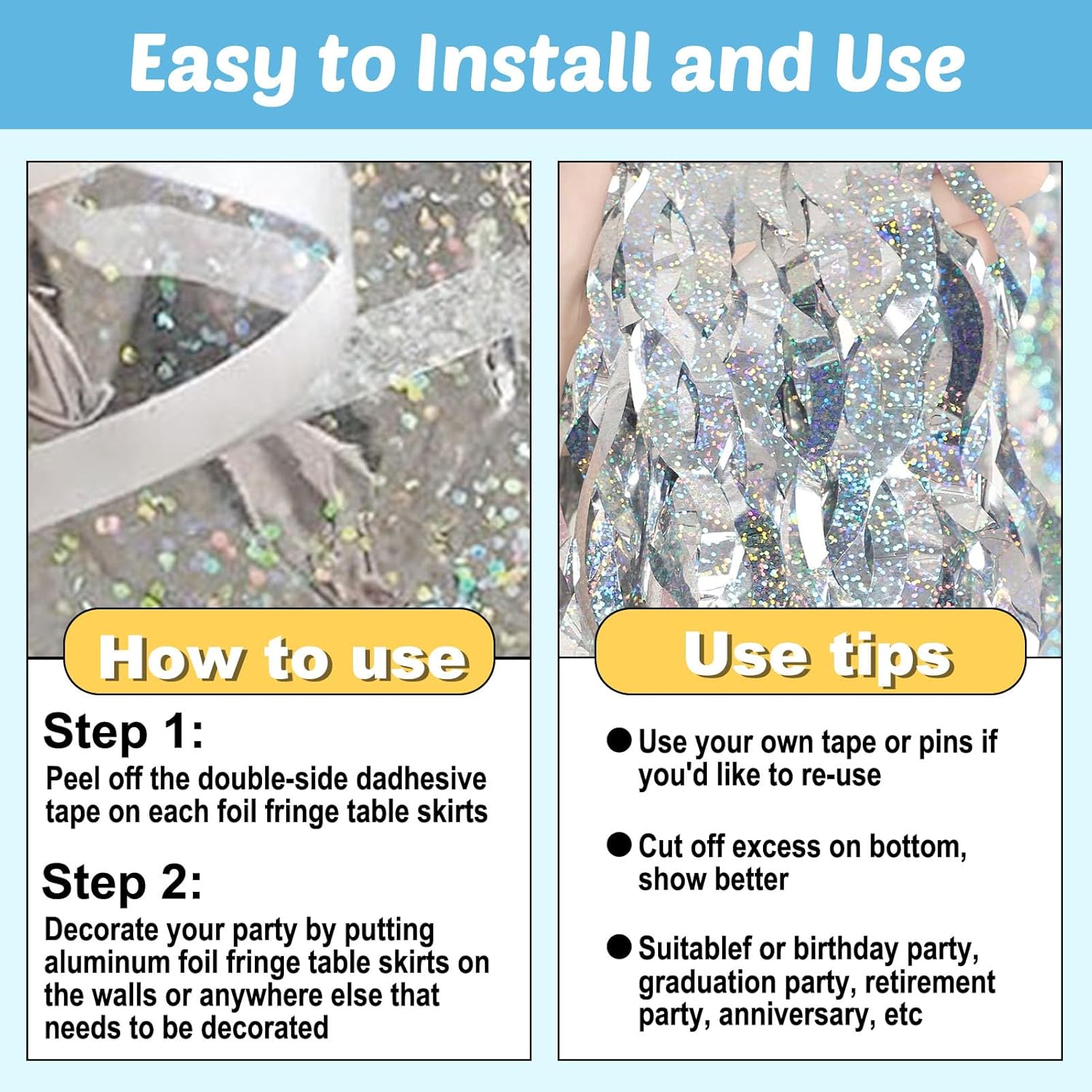 - Beautiful decoration: you can use these tinsel fringe table skirt to decorate a classroom, the stage for school program, a homecoming float, a wedding decoration, birthday party, Disco party, baby shower, halloween, christmas, new year's eve, bachelorette party, anniversary Memorial, Hollywood Party, independence Day, Carnival Party, Bridal Shower, Graduation and more.