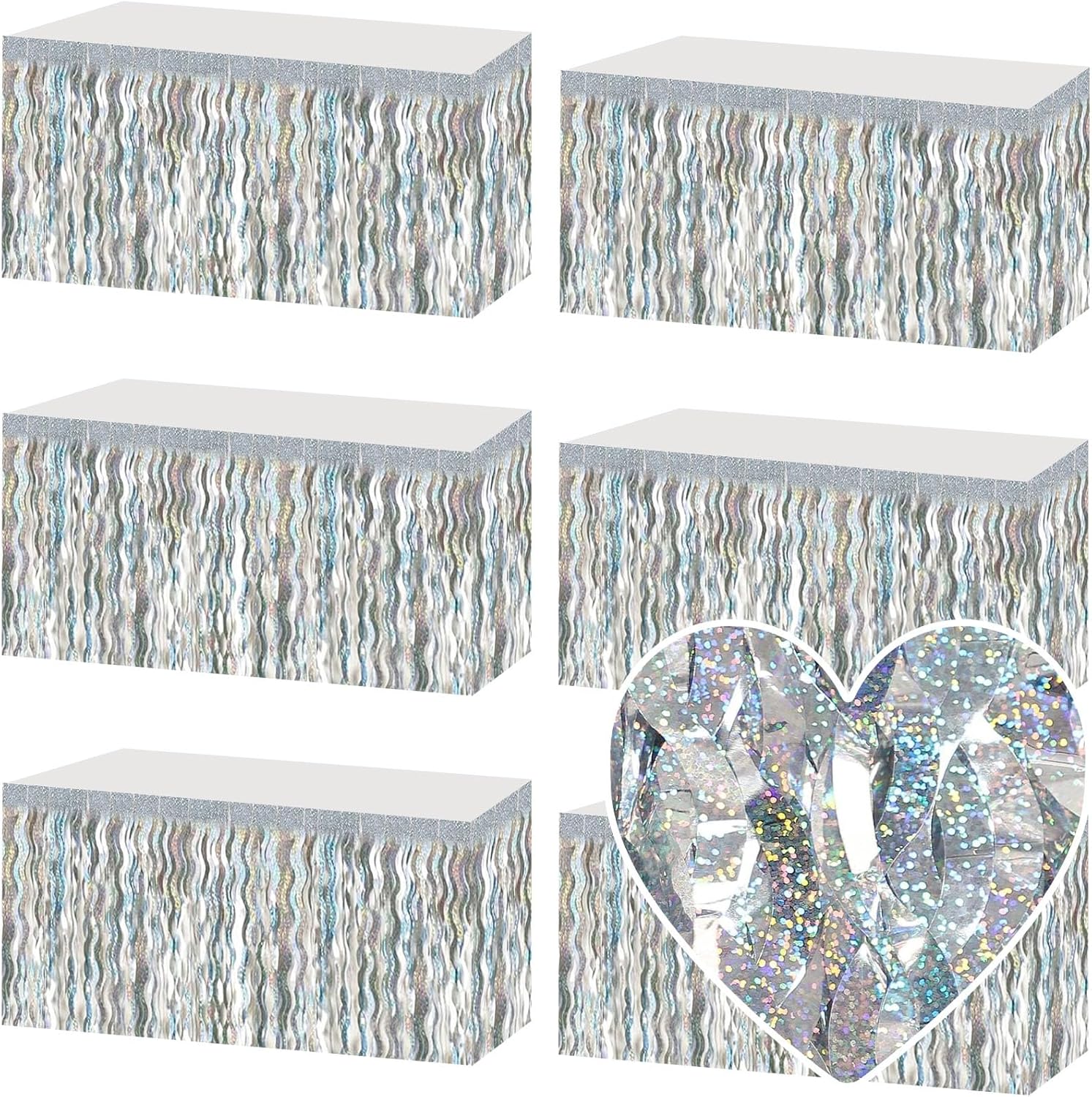 6 Pack 29x108 Inch Silver Wave Foil Fringe Table Skirts Metallic Banner for Tinsel Streamer Garland Backdrop for Parade Floats Mother's, Graduate, Mardi Gras, Birthday, Wedding Party Decorations