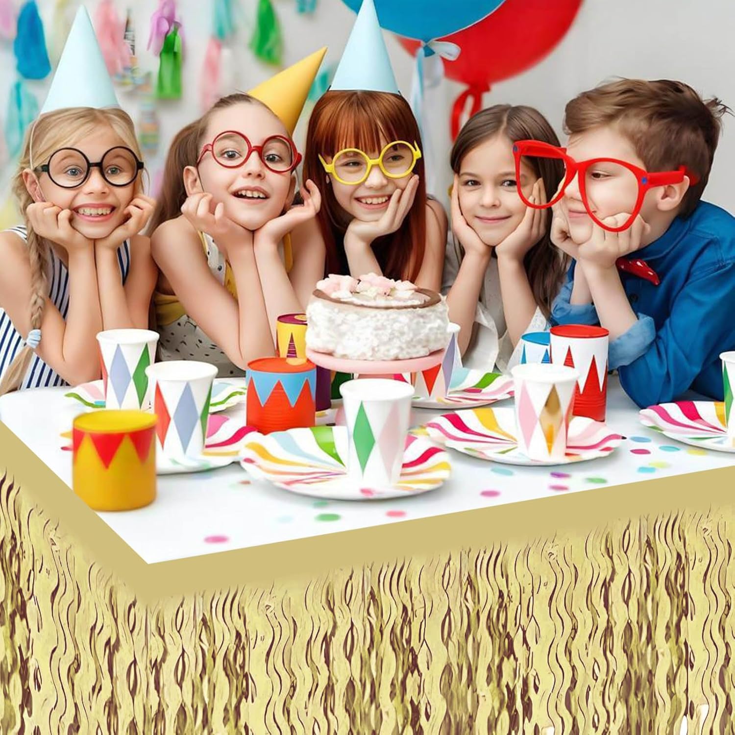 - Package Includes: 6pcs/set metallic fringe table skirts / shiny tassel banner, beautiful and shiny, provide you with great decoration effects, Each pack of table skirt measures 29x108 inches. Each one will be 9 Ft long, 6 pack will cover 54 FT length of tables.