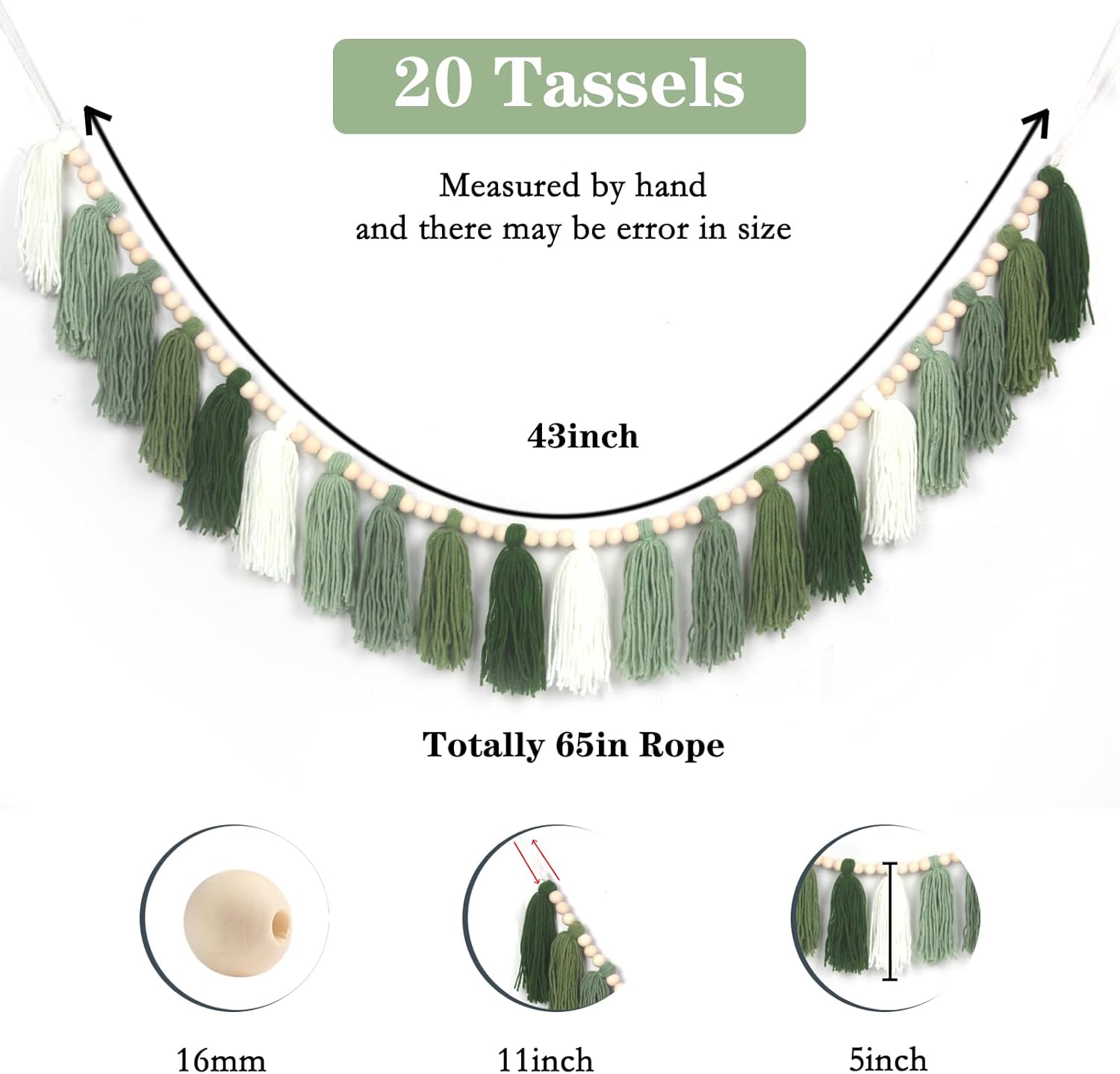 Green Boho Yarn Tassel Garland Sage Green Garland Wall Hanging Decor Forest Woodland Tassel Banner with Beads for Nursery Classroom Office Birthday Party Kids Room Baby Shower Decoration