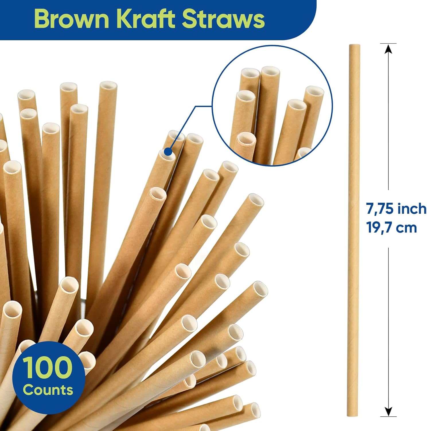 Brown Kraft Paper Straws for Drinking 7.75" x 0.24" - 100 Counts, for Bar, Restaurant, Food Supply, Catering