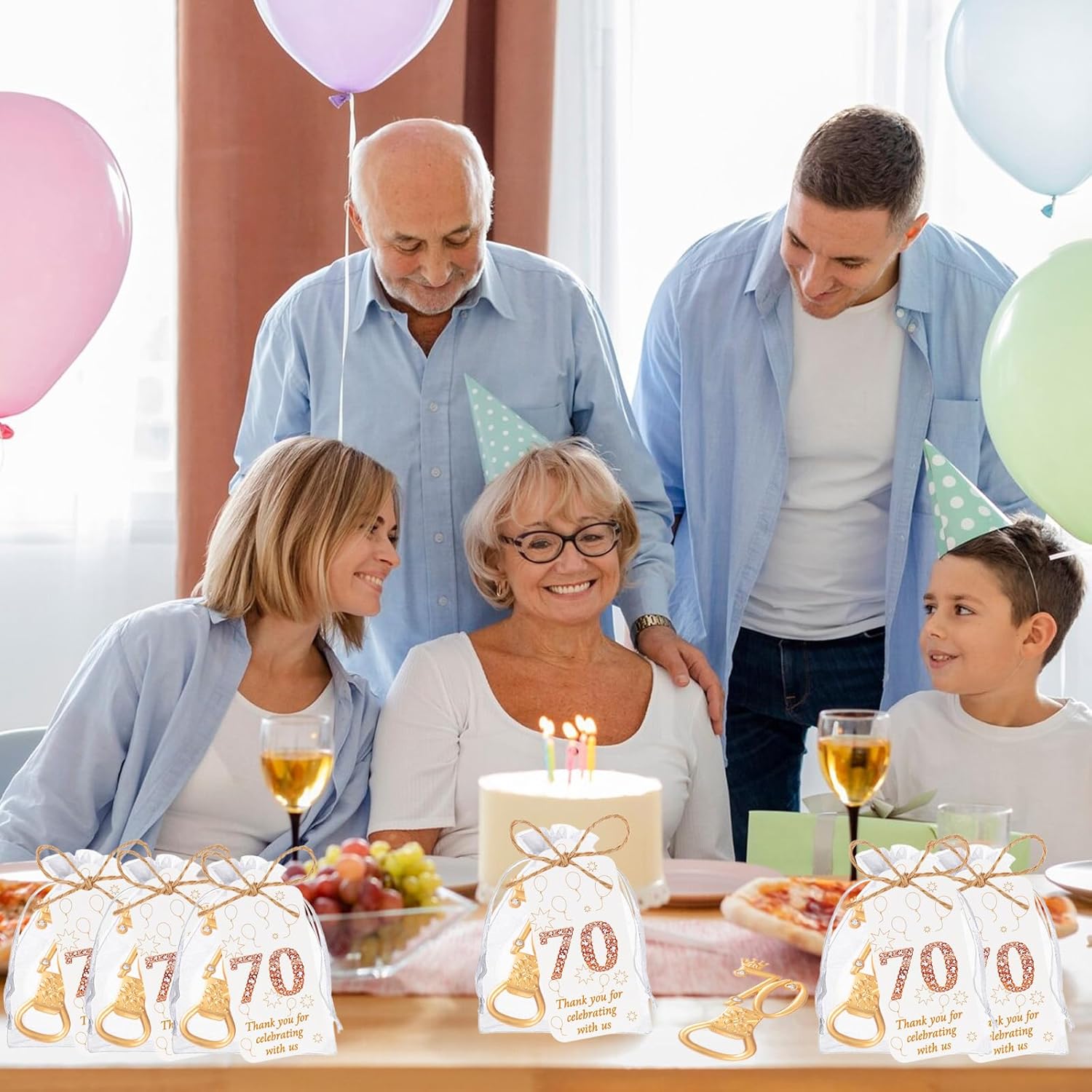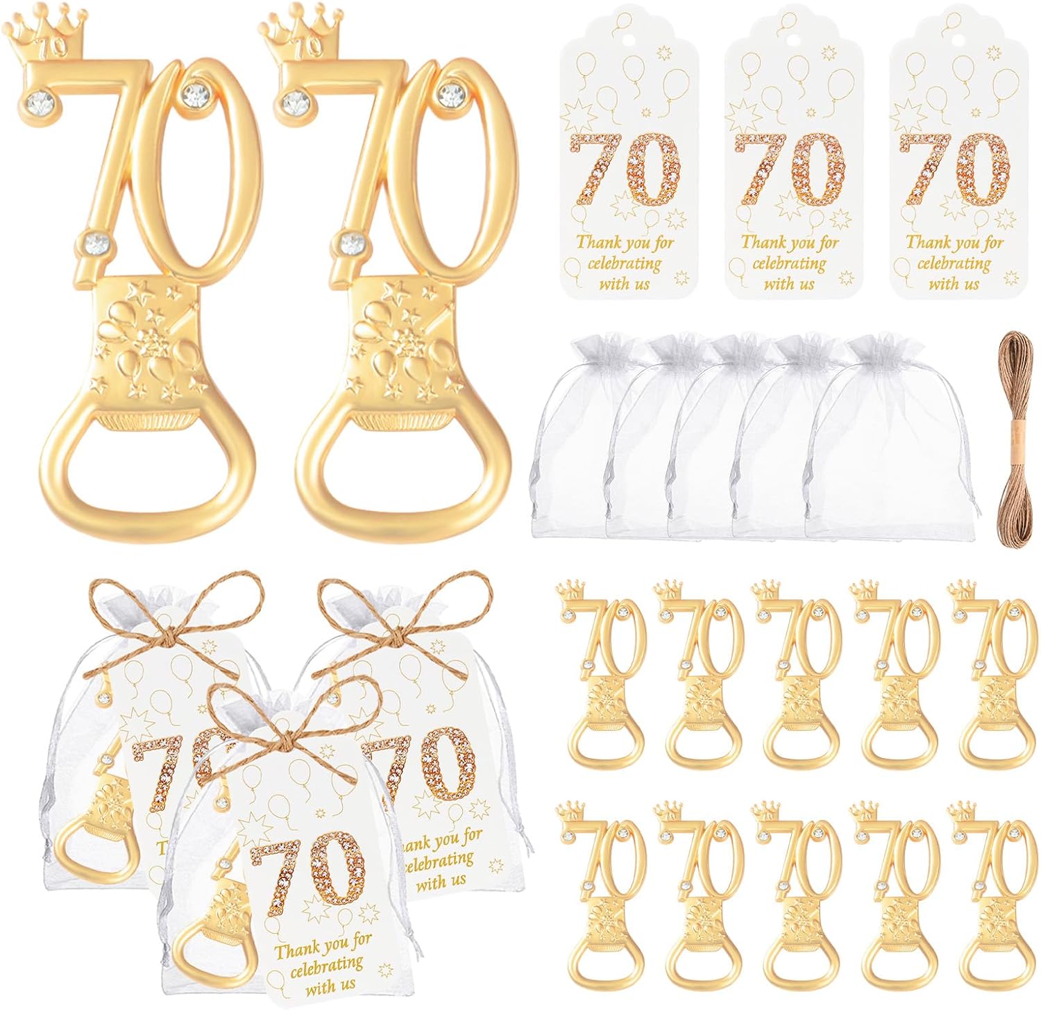 - High Quality Material: This 70th birthday bottle opener favors is made of high quality metal with gold-plated surface, sturdy and durable, convenient and practical, perfect for all kinds of party decorations. The main material of the thank you card is paper, the main colour is white and gold, which gives people a fashionable feeling, as a decoration to add atmosphere to the important party scene, bring guests a different experience