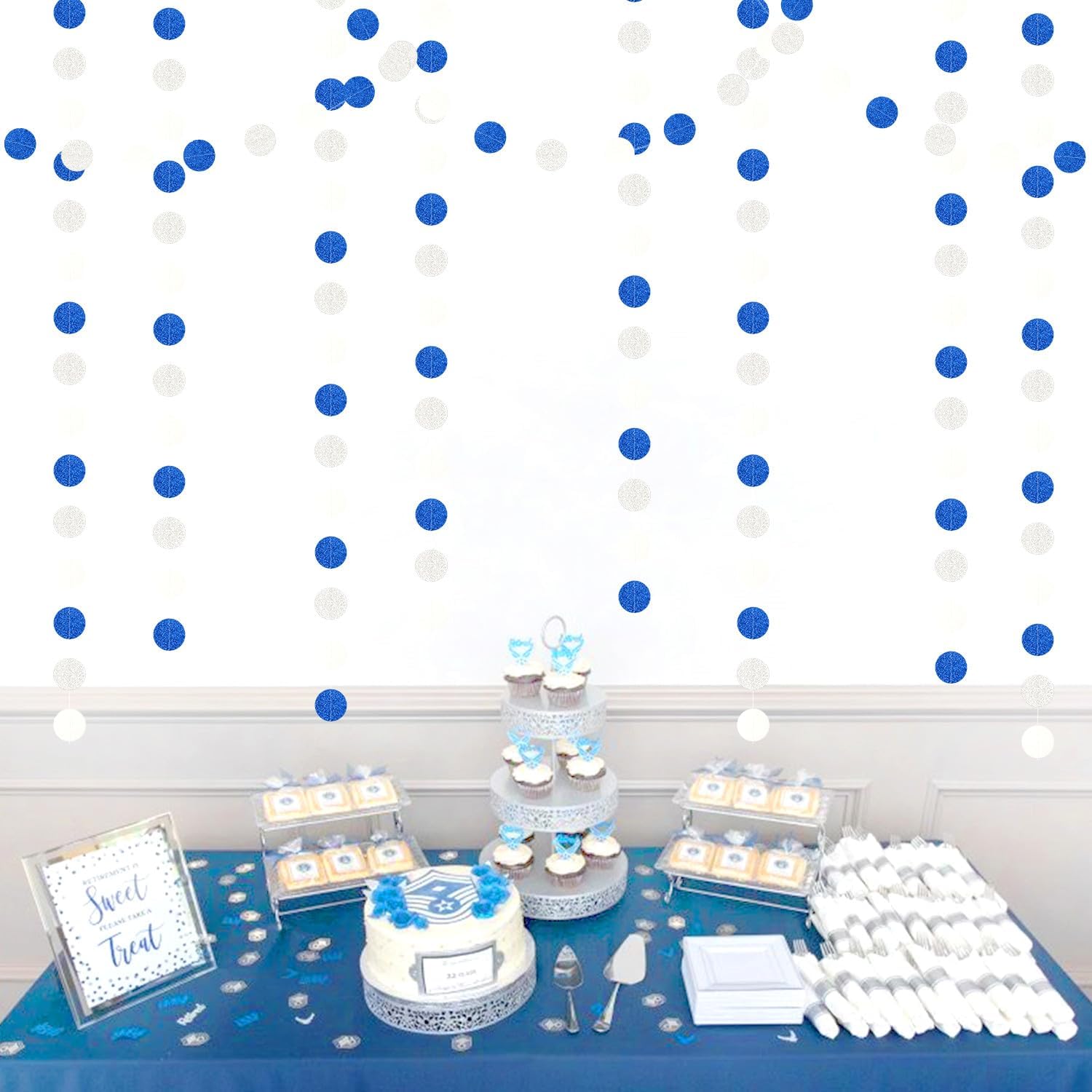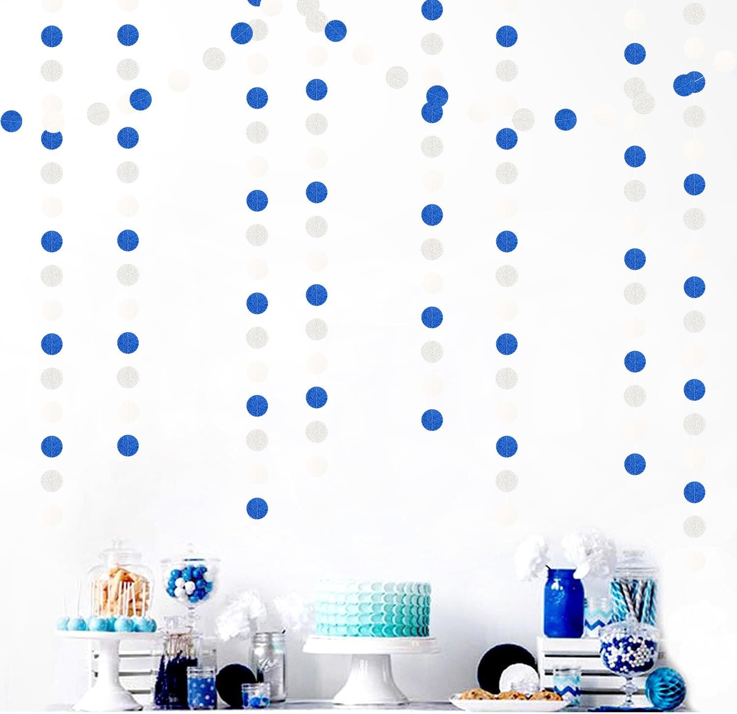 - PACKAGE CONTAINS: This set has four navy blue white silver circle paper garland,the length of each strand is 4 meters/13 feet, the total length is 16 meters/52 feet.The size is 2IN.