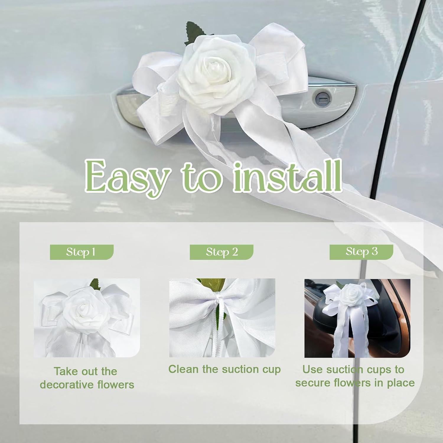 - Easy Installation: Featuring a convenient tie design, these decorations bouquet are simple to install without tools, ensuring a secure fit that wonโt damage the car paint or mirrors