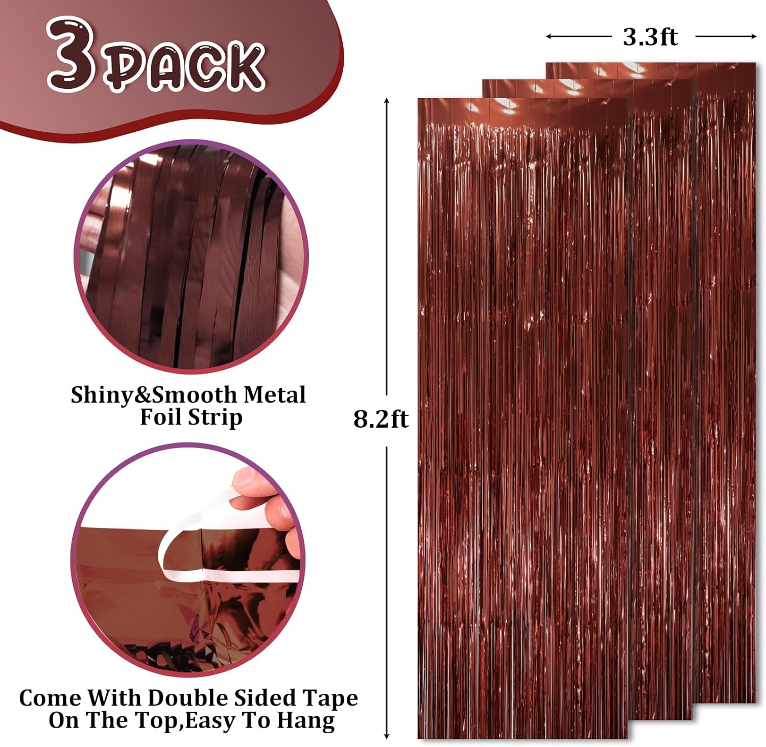 3 Pack 3.3 x 8.2 ft Brown Foil Fringe Backdrop Curtains, Tinsel Streamers Party Decorations, Fringe Backdrop, Door Shimmer for Thanksgiving Day or Birthday Party