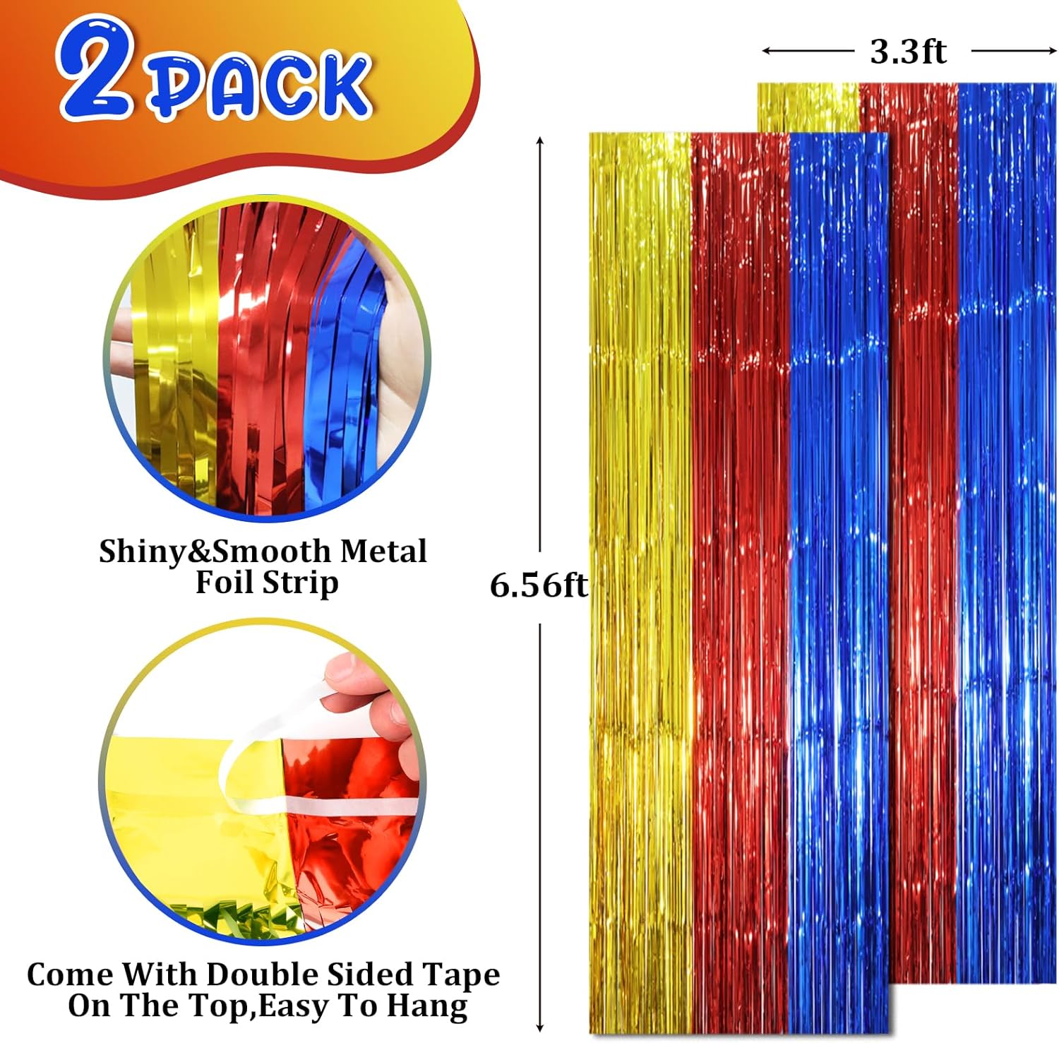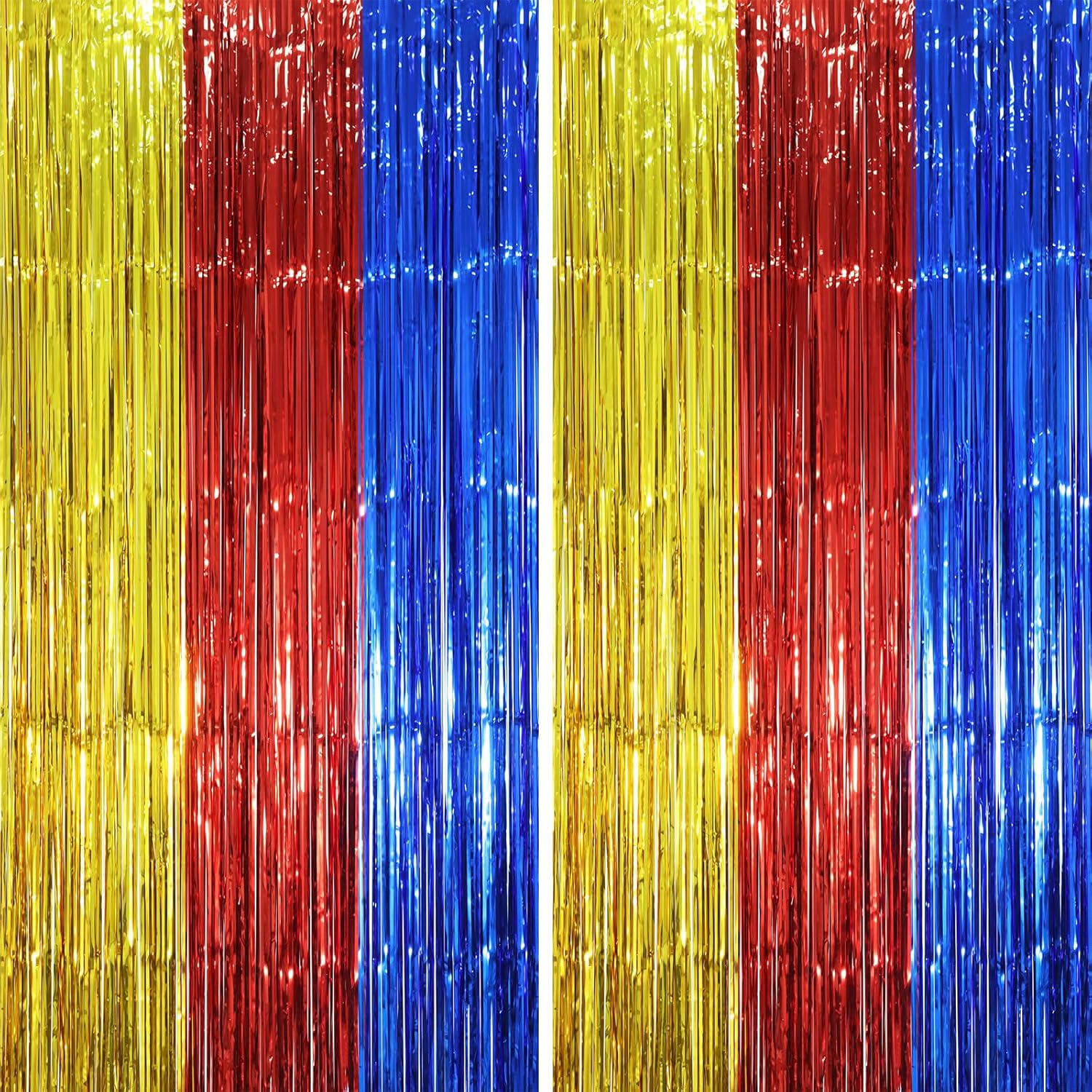 - Stunning Decorative Set: You'll receive 2 pcs blue red and gold foil fringe backdrop curtains, each measuring 3.28 ft (wide)Γ6.56 ft (drop). Enough length foil fringe curtains backdrops are perfect for the door or wall to create an impressive decoration