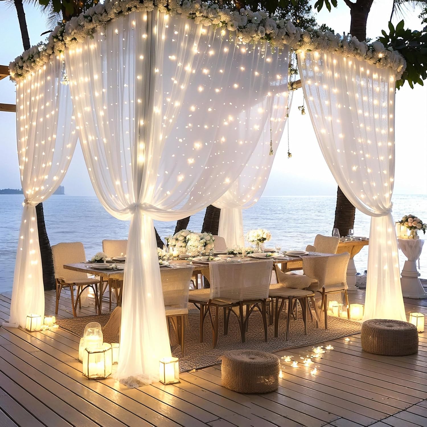 - White Tulle Backdrop Curtain with Lights String: Each set includes 2 pieces of 5x10ft sheer white tulle curtains, a 10 ft warm white LED light string, and 12 clips. Perfect for weddings, baby showers, and birthday parties, this backdrop creates a romantic and enchanting atmosphere, making every moment unforgettable