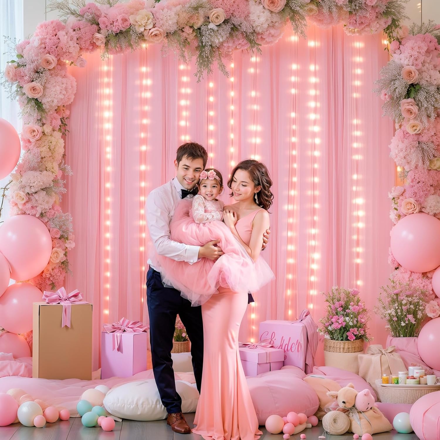 - Backdrop Curtains with Lights: Each set includes 4 pieces of 5x8ft pink sheer tulle backdrop curtains, 2 sets of 10 ft warm white LED string lights, and 24 clips. These sheer curtains with lights are perfect for baby shower photo booths or wedding reception backdrops, bringing a romantic and charming atmosphere to evening events