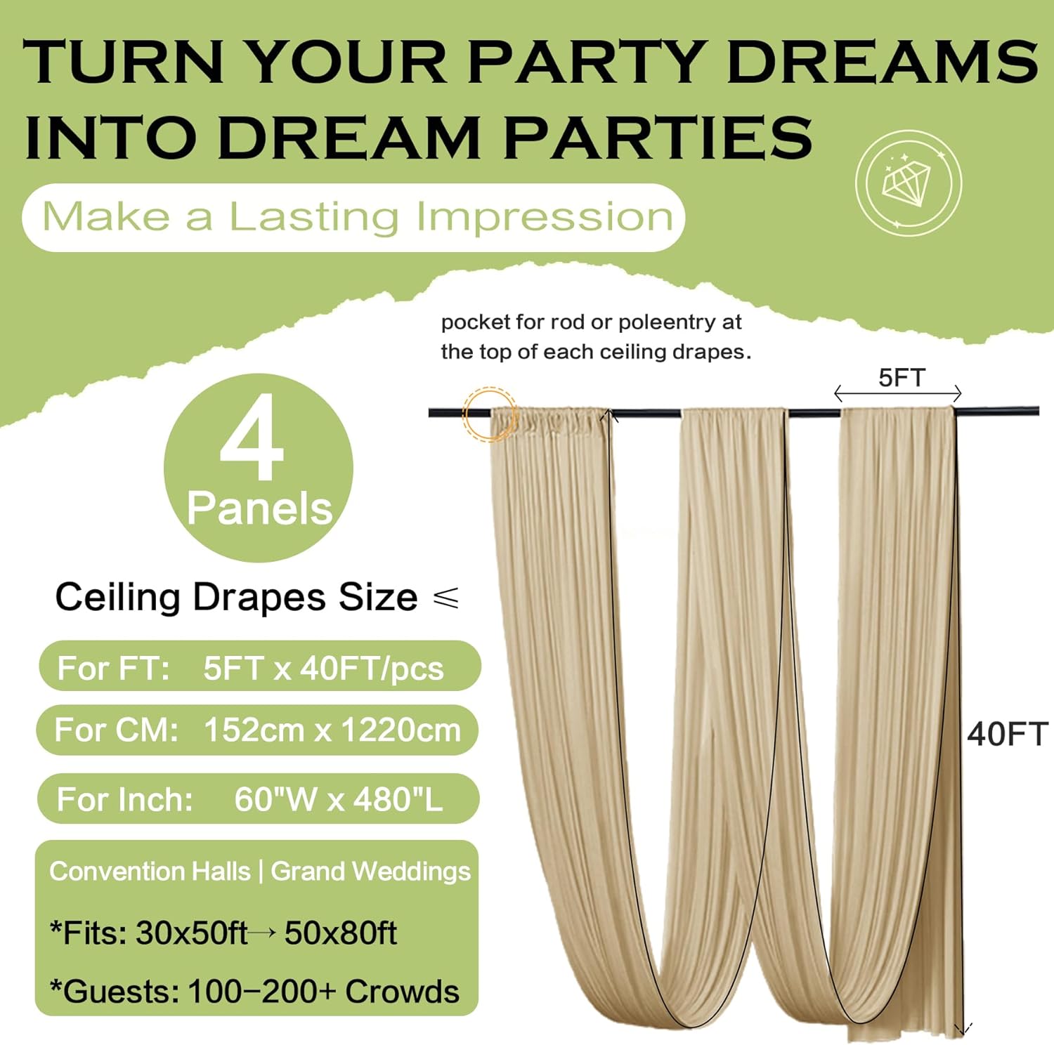 PartyVillage 20ftx40ft Beige Ceiling Curtain for Wedding Parties – 4 Panels Wrinkle-Free 40 FT Long Tent Draping Curtains for Wedding, Birthday & Theme Parties, 40ft Height with Rod Pocket