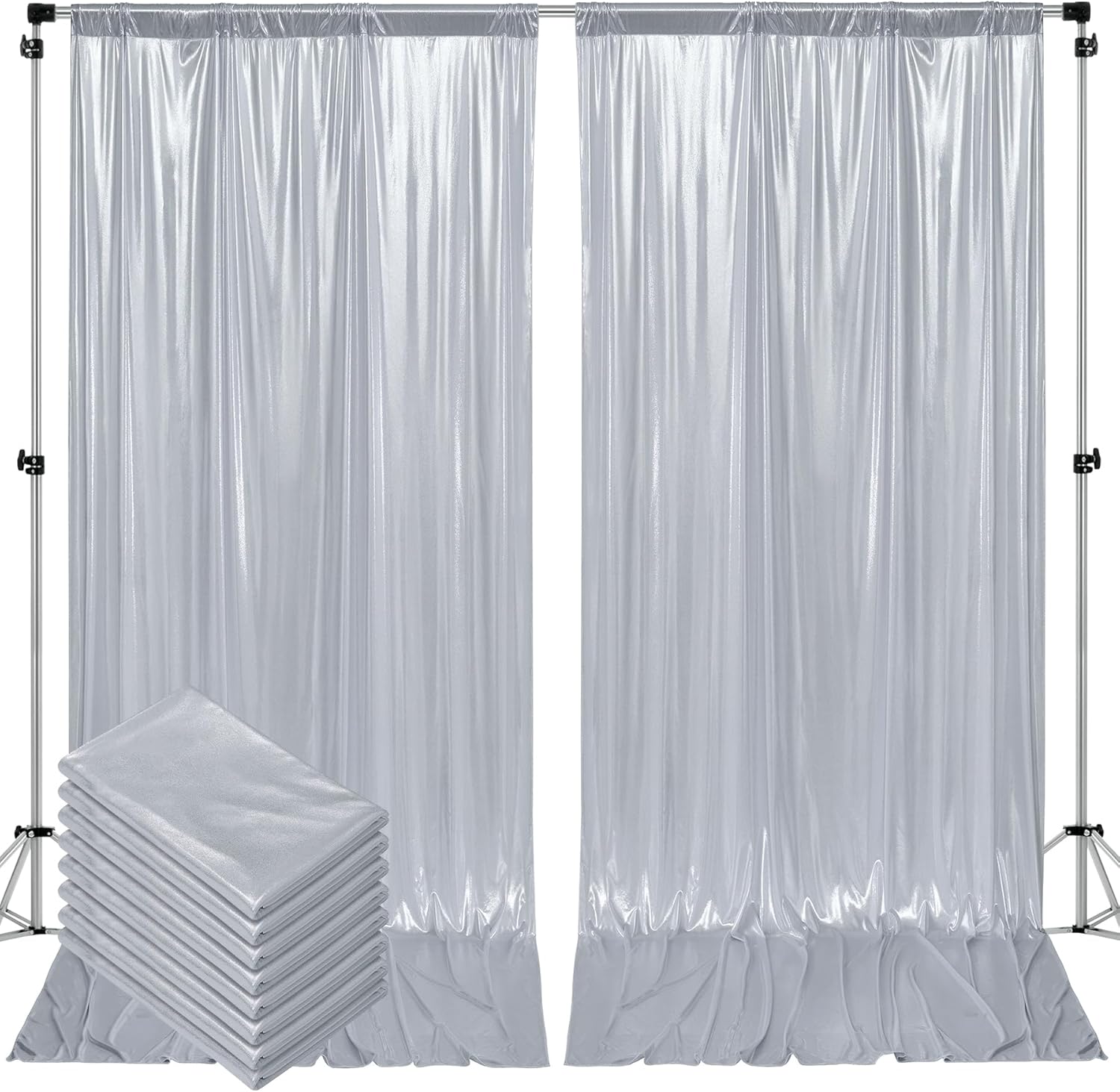 - New Glitter Thick Silver Backdrop Cloth: Package include 8pc 5*10ft silver backdrop drapes. Made of soft and smooth polyester fabric and glitter, more superior than ordinary sequin backdrop curtains. It's more thick and not falling off sequins, make your parties more charming and sparkling.
