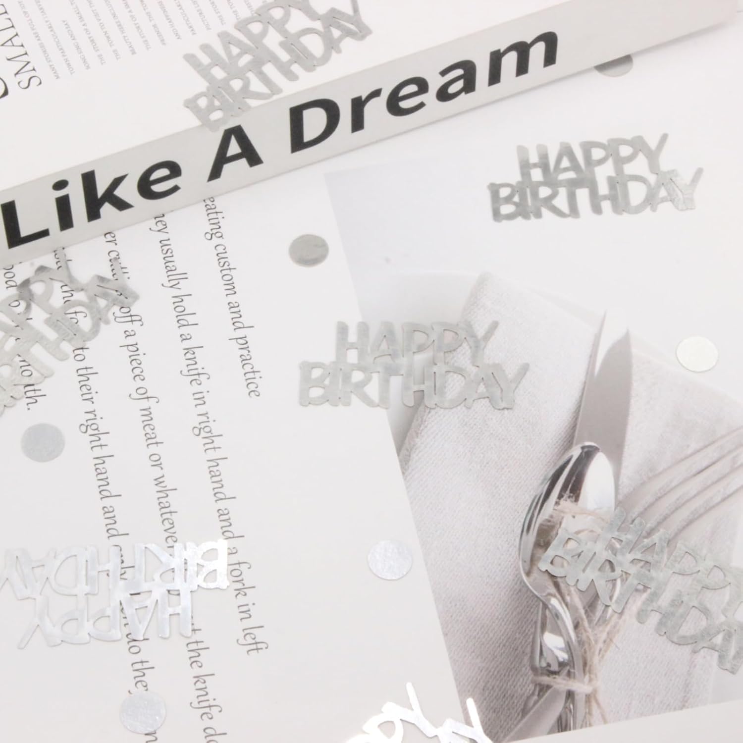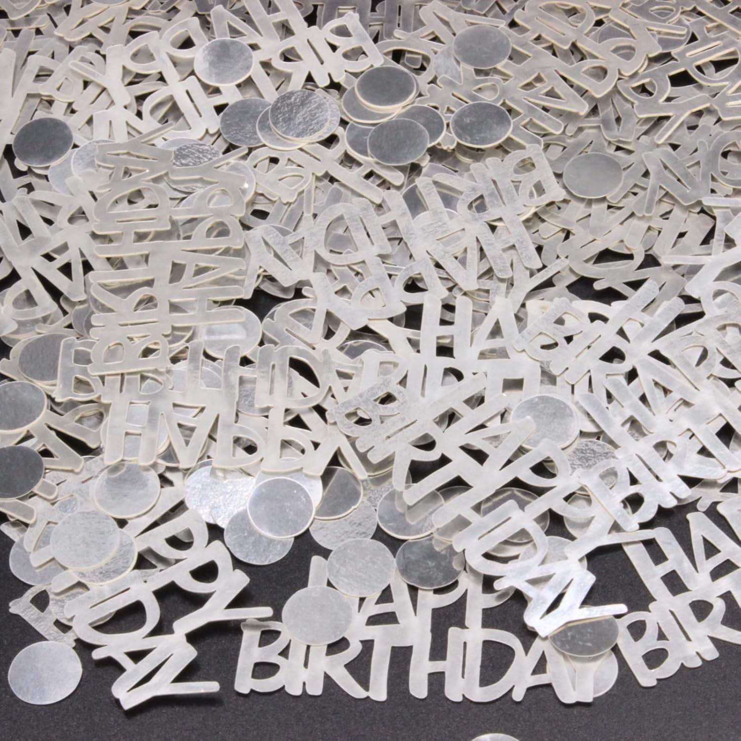- Material: Silver happy birthday confetti for table is made of glitter thick card. The silver confetti is indelible, reusable, and sparkling in the sunlight, and it’s a very attractive presence wherever it goes