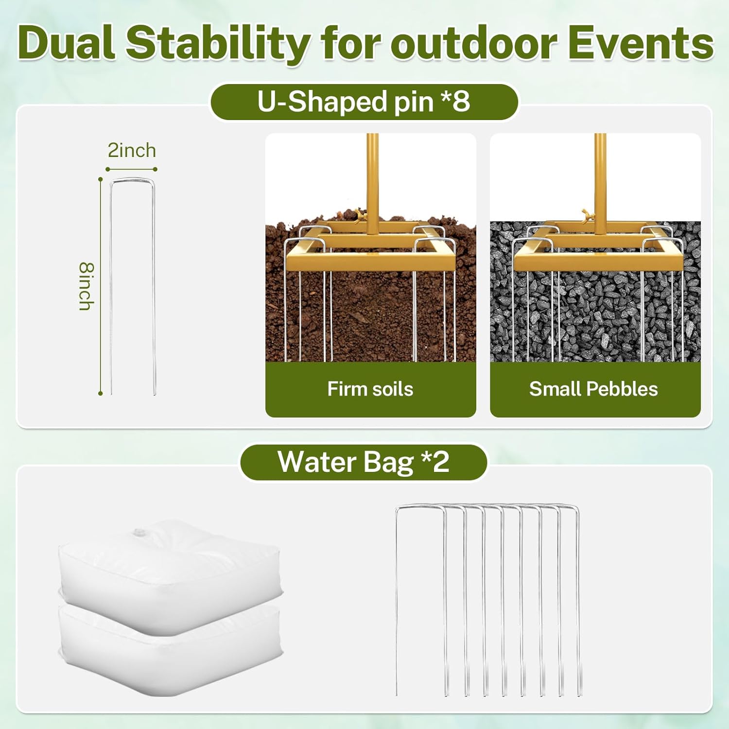 - ăEnhanced Stability Featuresă For added security, our back drop stand comes with 8 ground stakes to anchor it on outdoor surfaces like grass or gravel. Additionally, two extra water bags are included to increase wind resistance during outdoor events, ensuring the stand remains firmly in place indoors or outdoors.