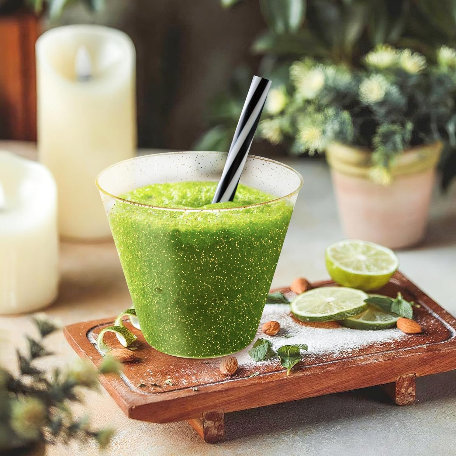 [200 Pack] 9oz Plastic Cups with Gold Glitter Sturdy & Food Safe Plastic Wine Glasses Disposable Cups Party Wedding Cups Cocktail Glasses for Wine, Juice & Cold Beverages
