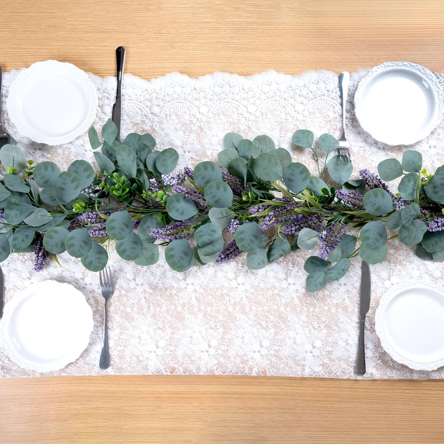 - 【eucalyptus garland with flower for table】6ft long handmade artificial silk silver dollar eucalyptus garland has rich leaves and a variety of light green eucalyptus and Purple Flower matte leaves and provides lifelike texture and tons of volume. Each eucalyptus garland is printed with veins to make it vivid.