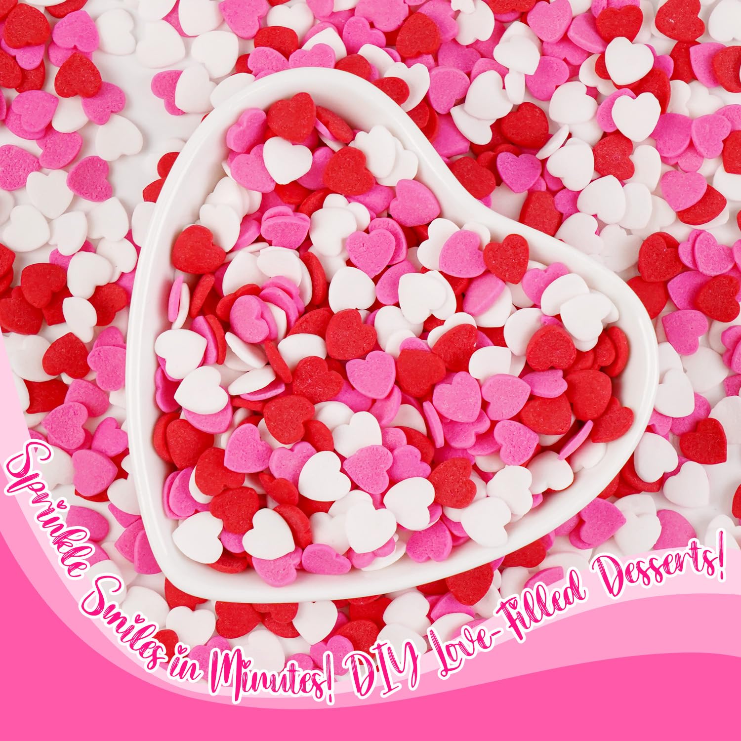 - The Edible Pink Hearts Sprinkles are heart-shaped design in red, pink and white. They are a delight for festives, decorating cupcakes, cakes, donuts, cookies, ice cream, waffles and adding the romance and love in your baking.