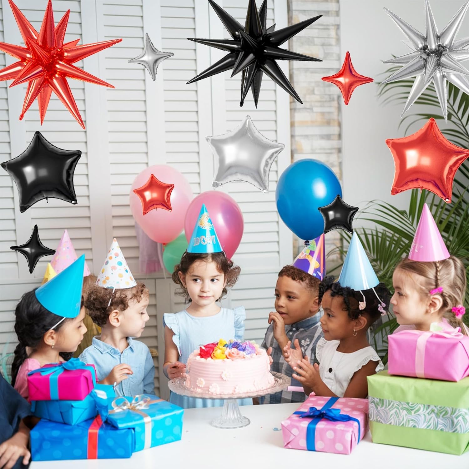 - ăRed Black Silver Star BalloonsăThe package includes:6pcs 22-inch Star-Shape balloons(Red*2,Black*2,Silver*2), 4pcs 10-inch Four-Pointed Star balloons(Red*2,Black*1,Silver*1), 3pcs 18-inch Five-Pointed Star balloons(Red*1,Black*1,Silver*1), 3pcs 10-inch Five-Pointed Star Shape balloons(Red*1,Black*1,Silver*1),1 dispense and 1 straw. These foil star balloons are Great for birthdays, weddings, baby showers, and engagement parties
