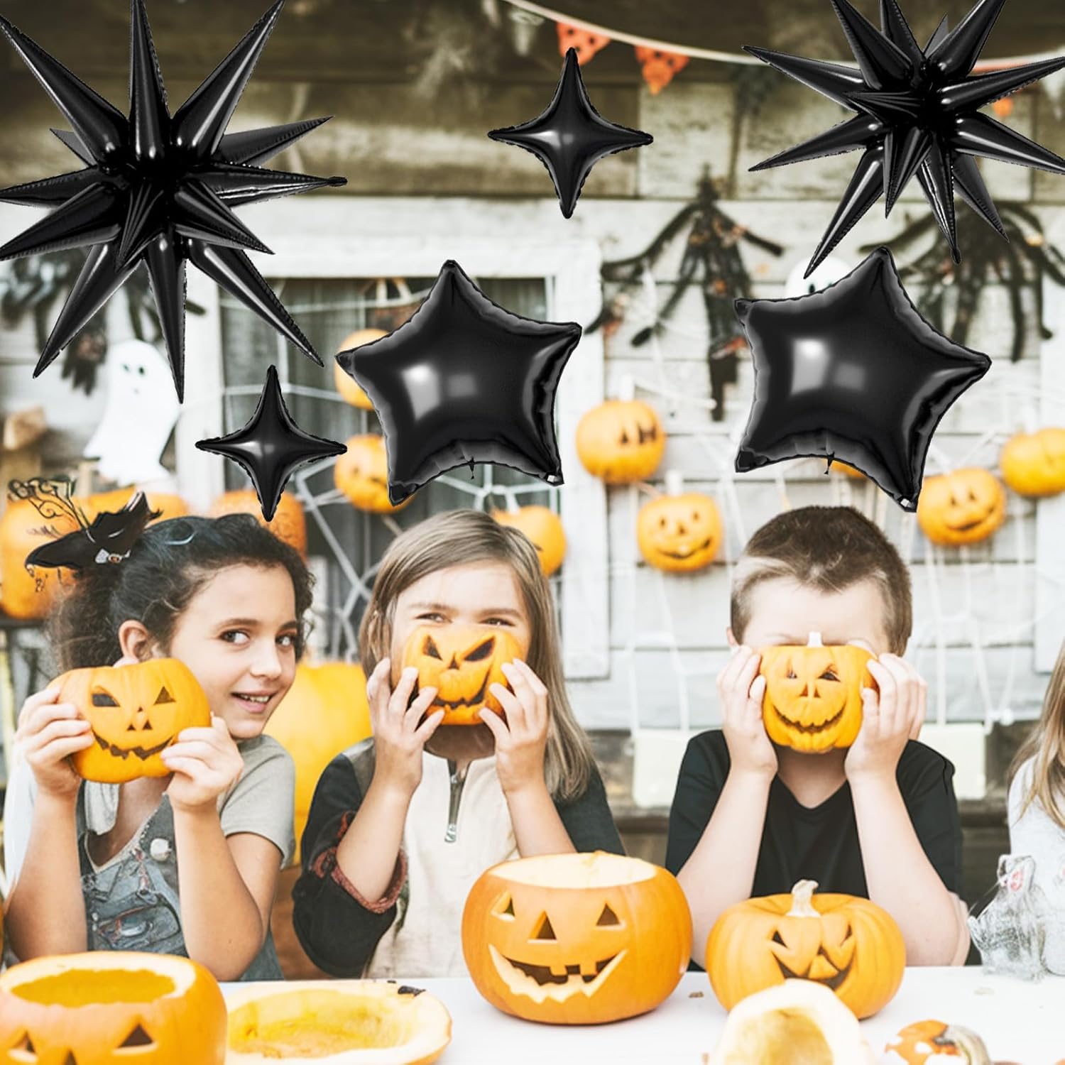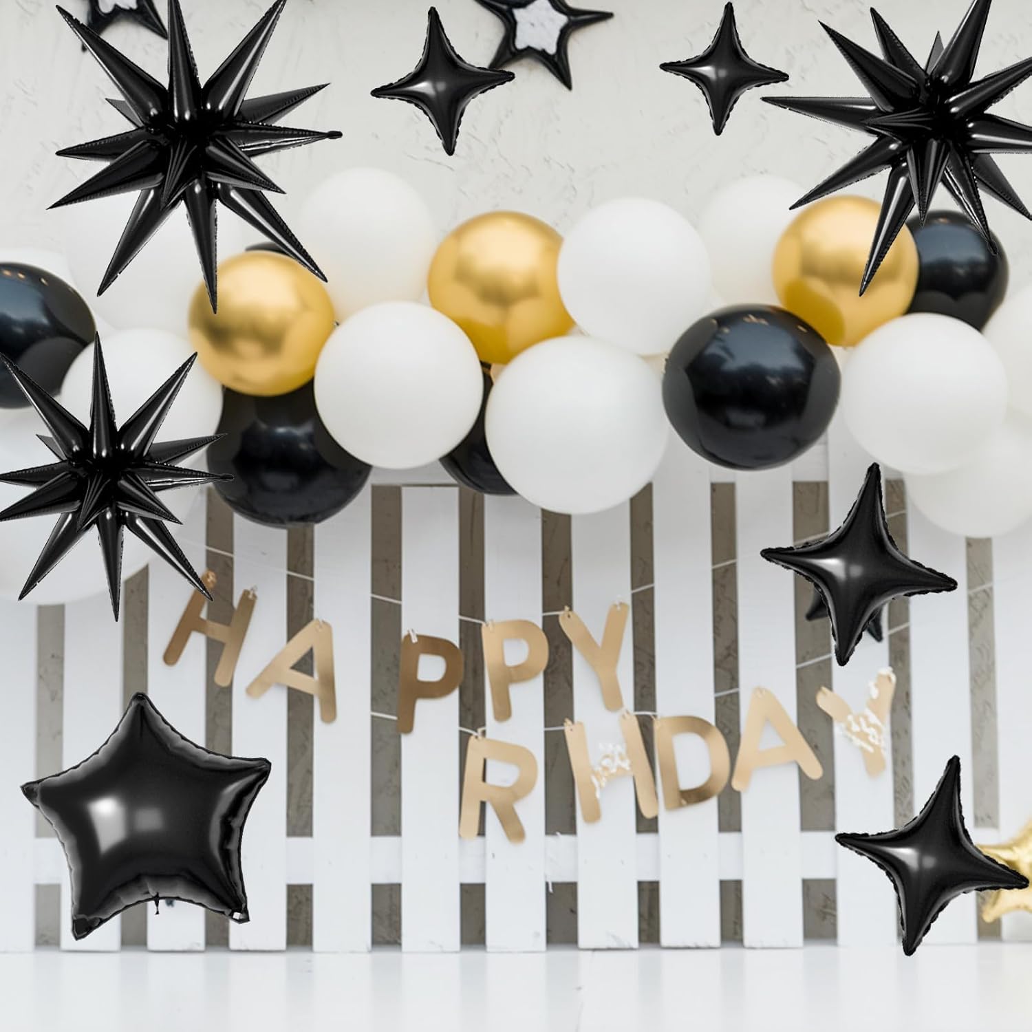 - ăBlack Star BalloonsăThe package includes:6pcs 22-inch Star-Shape balloons(Black), 5pcs 10-inch Four-Pointed Star balloons(Black), 2pcs 18-inch Five-Pointed Star balloons(Black), 3pcs 10-inch Five-Pointed Star Shape balloons(Black),1 dispense and 1 straw. These foil star balloons are Great for birthdays, weddings, baby showers, and engagement parties