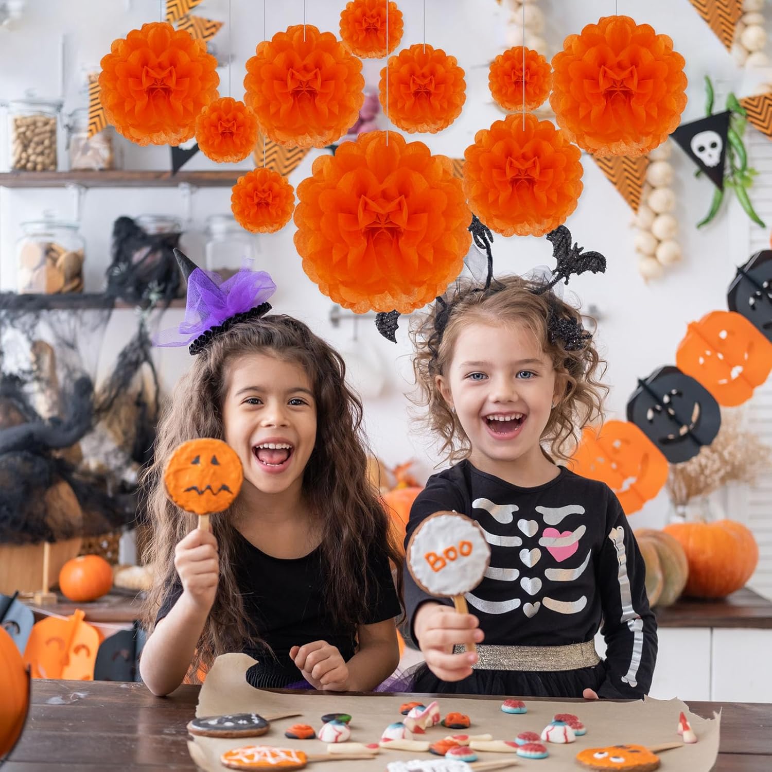 - 【Large Set】20 Pieces orange paper flower balls include 6 of 6-inch, 6 of 10-inch, 5 of 12-inch, and 3 of extra-large 14 inch paper pom pom flowers.