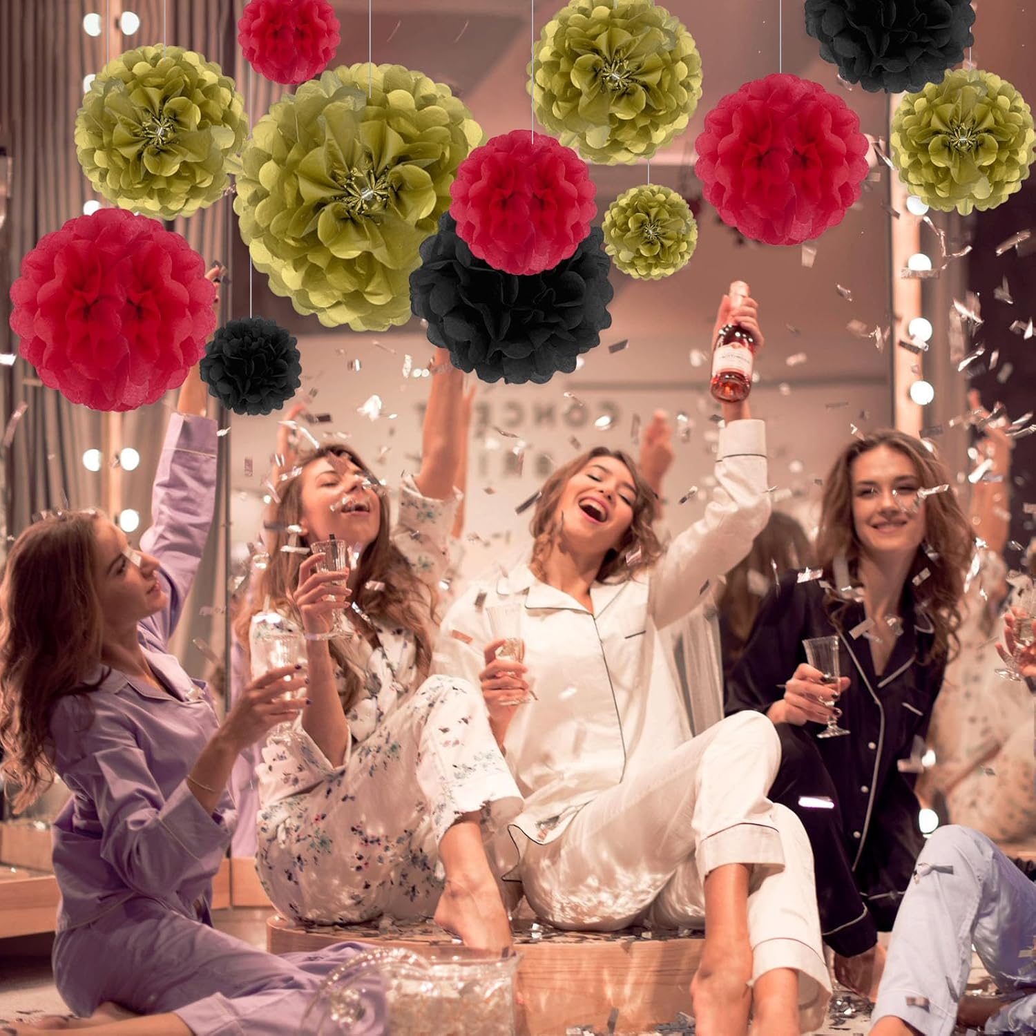 - 【Large Set】18 Pieces paper flower balls include 6 of 6-inch, 6 of 10-inch, 3 of 12-inch, and 3 of extra-large 14 inch paper pom pom flowers.This tissue flower set comes in 3 different colors including Red,Black,Gold, which will add charm to your celebration through different color combinations.