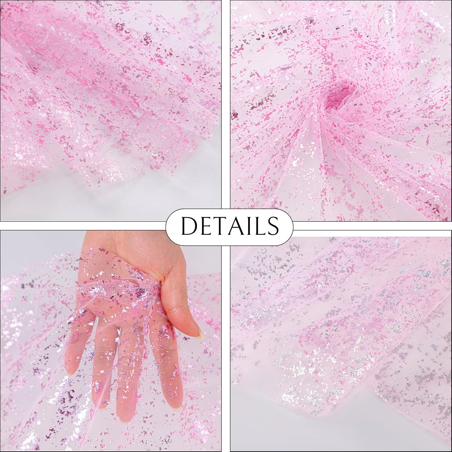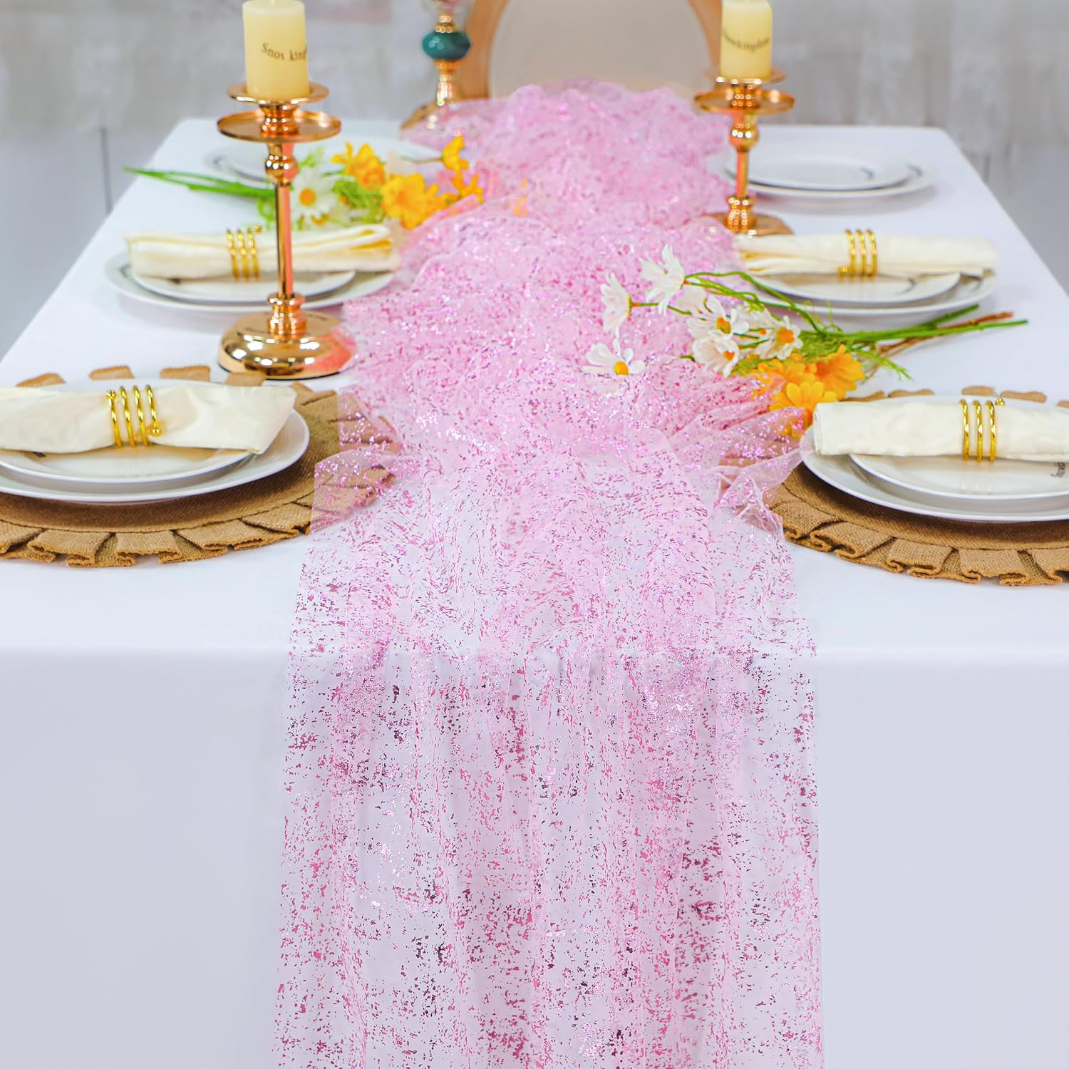 - Unique Design: Glittering metallic pink foil on a durable, quality sheer gauze fabric, making it lightweight and breathable. It is designed to be placed casually on tables or draped over table edges for an elegant atmosphere