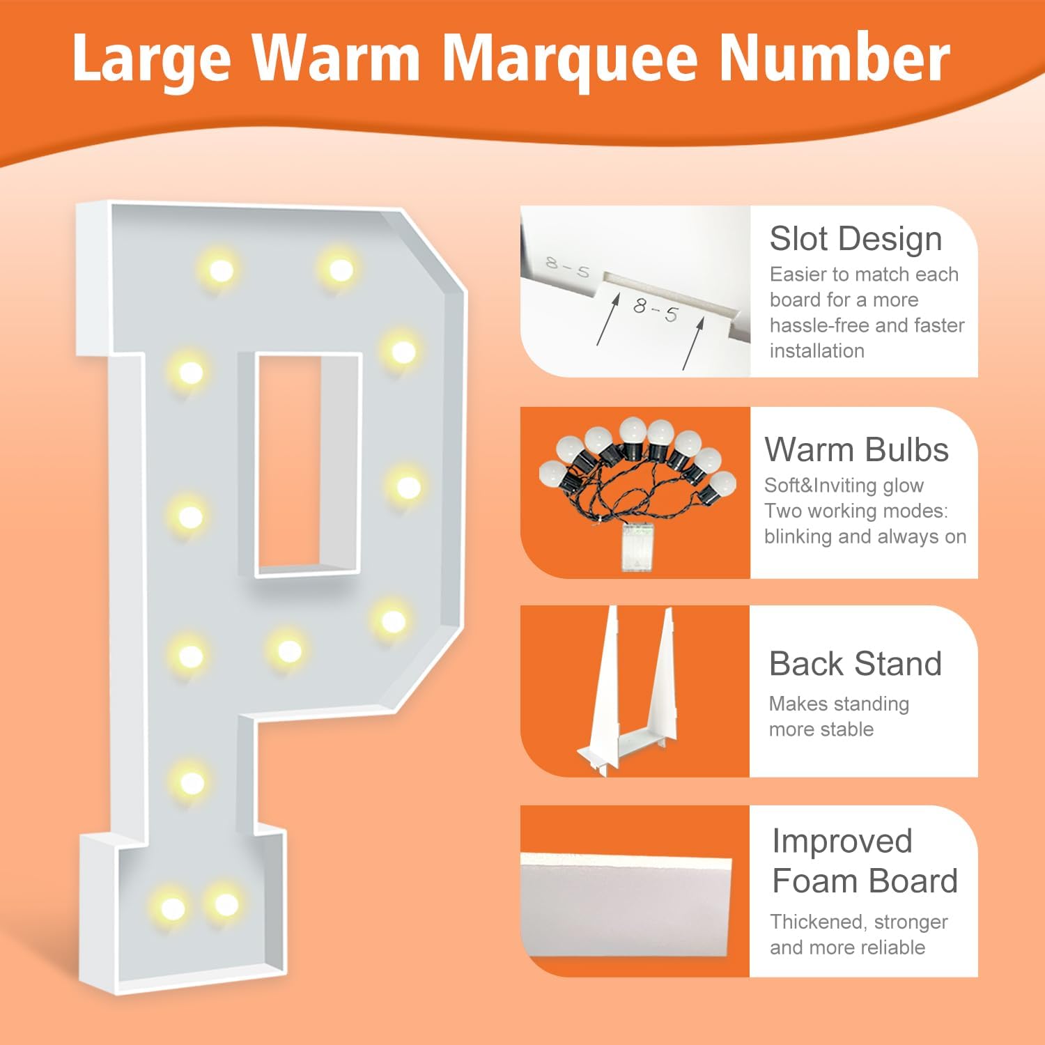 - IMPROVED FOAM BOARDS: Our marquee letters are made from high-density thickened foam boards, the slots and connectors can be tightly linked togethe for better stability. Each letter has a sturdy back stand to ensure that your party marquee sign will not tip over. (Tips: When outdoors, please place something heavy on the back stand to prevent the letter sign from blowing over).