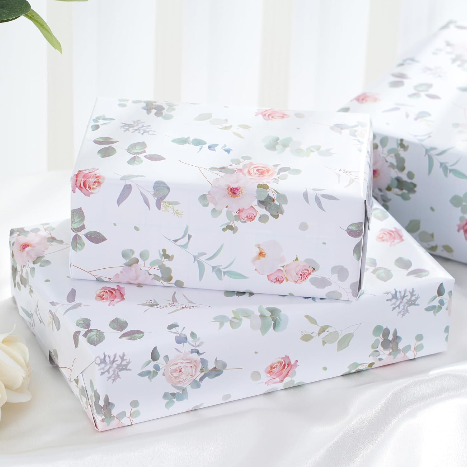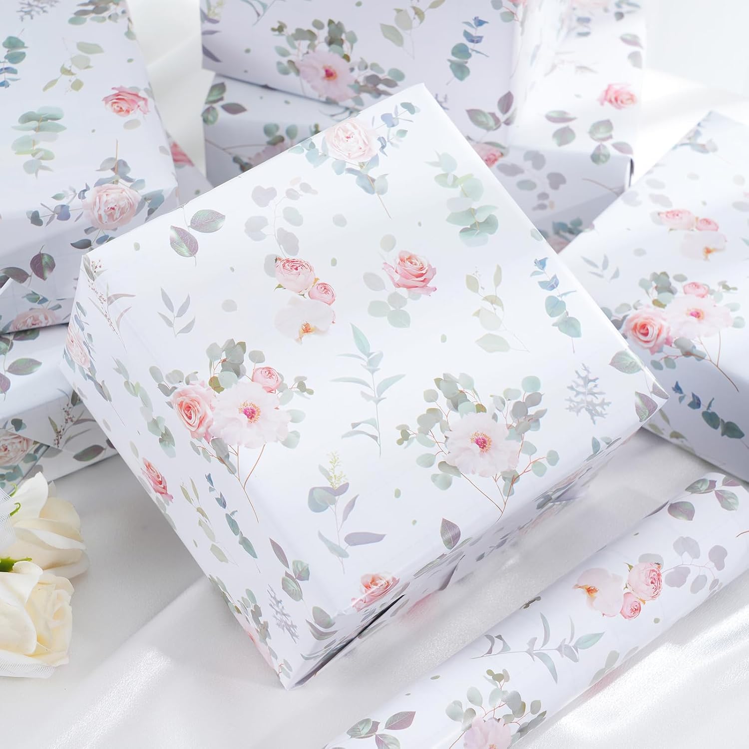 - ELEGANT DESIGN: A graceful design with soft - hued roses and eucalyptus leaves scattered across a clean, white background. Classic and modern wrapping paper is sure to make your gift stand out with elegance and romantic.
