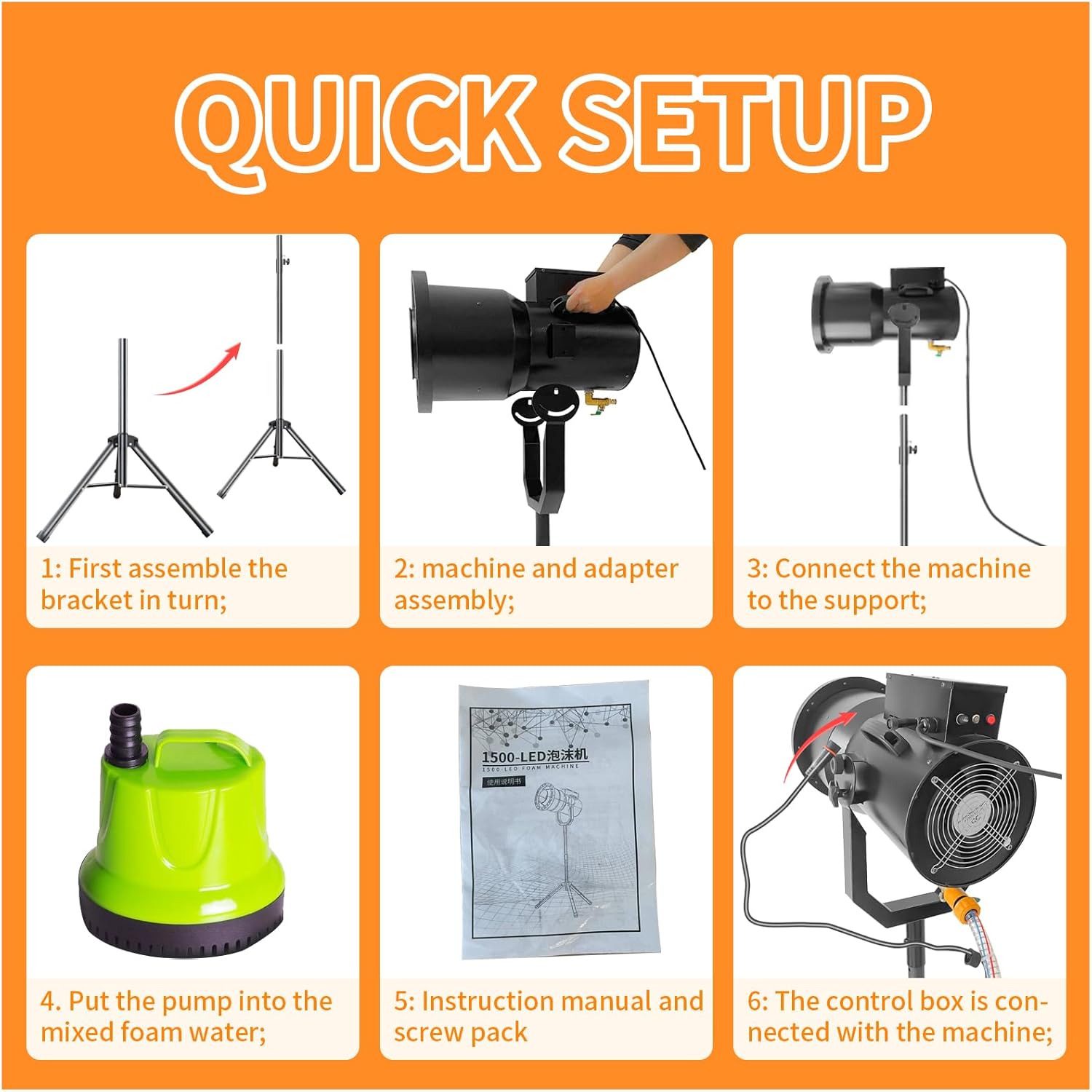- 【Portable Tripod Design & Quick Setup】 No bulky water tank needed! The included sturdy tripod allows flexible placement on any terrain (grass, concrete, stages). Assemble in minutes with lightweight parts: attach foam cannon, LED lights, and controller to the tripod—no plumbing required.