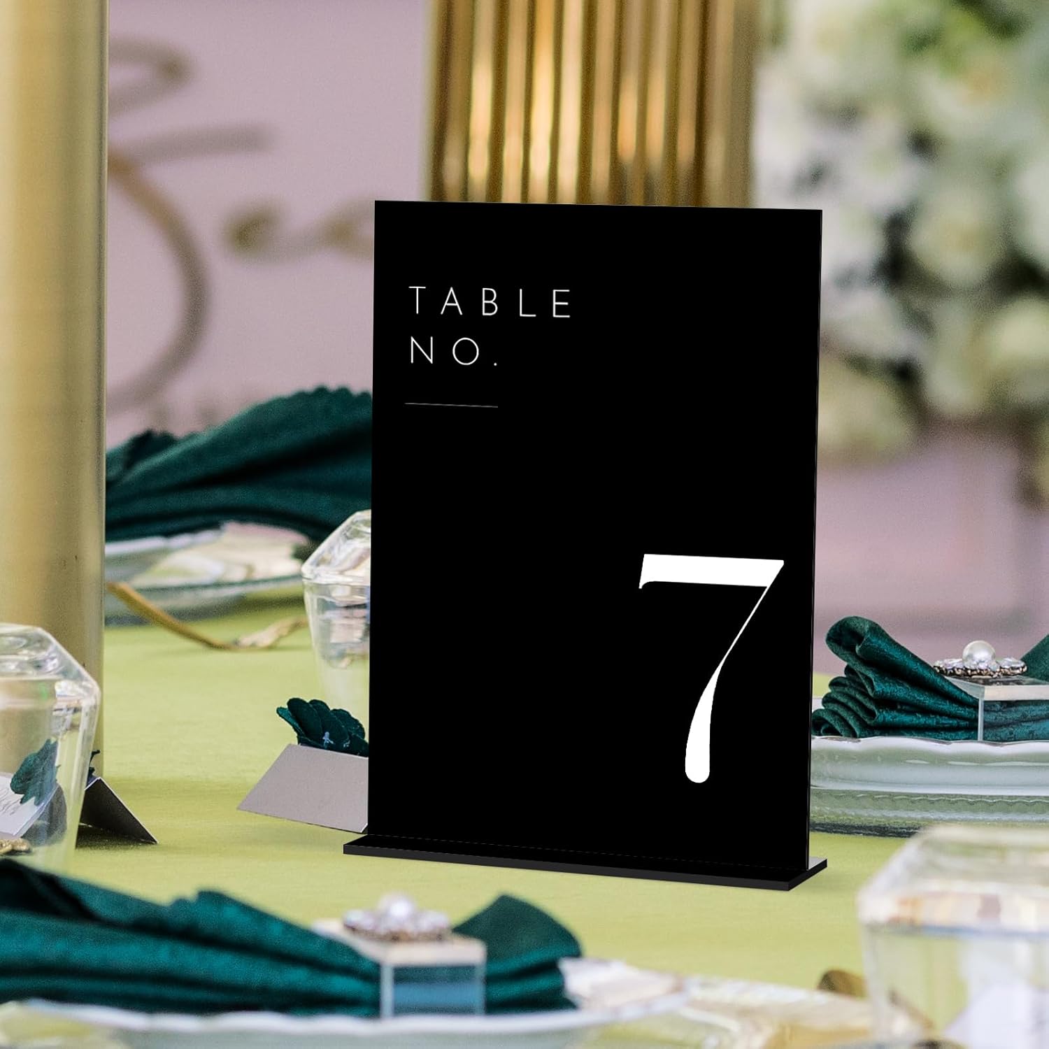 - PREMIUM QUALITY: These black acrylic table numbers with holders are made from high quality black acrylic panels and then printed with white letters in a simple arch design that won't go out of style and will last a long time.