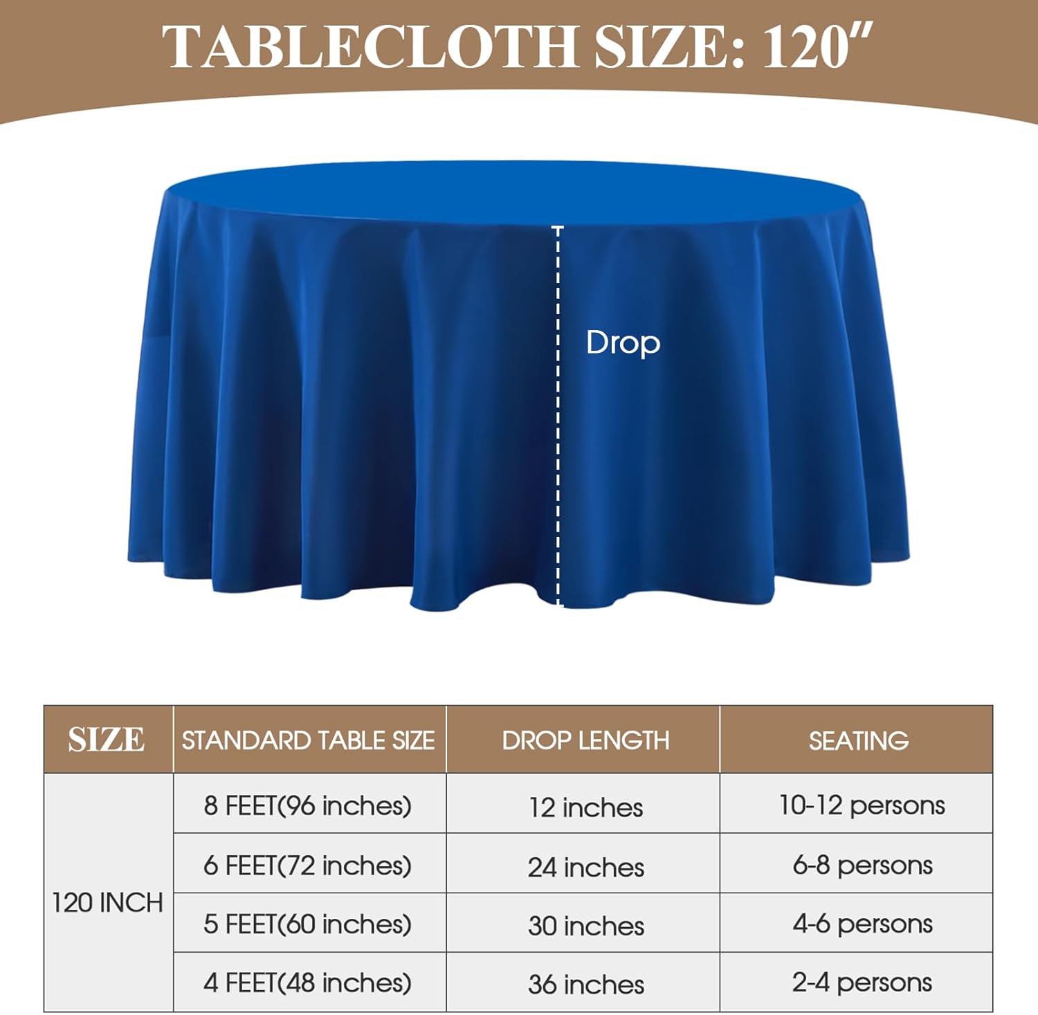 - Suitable Size: This polyester round tablecloth has multiple sizes to choose from, 90, 108, 120, 132 inches, which can meet the needs of tables of different sizes. In order to buy a tablecloth that is more suitable for your table, please measure the actual size of your table before purchasing and refer to our size chart