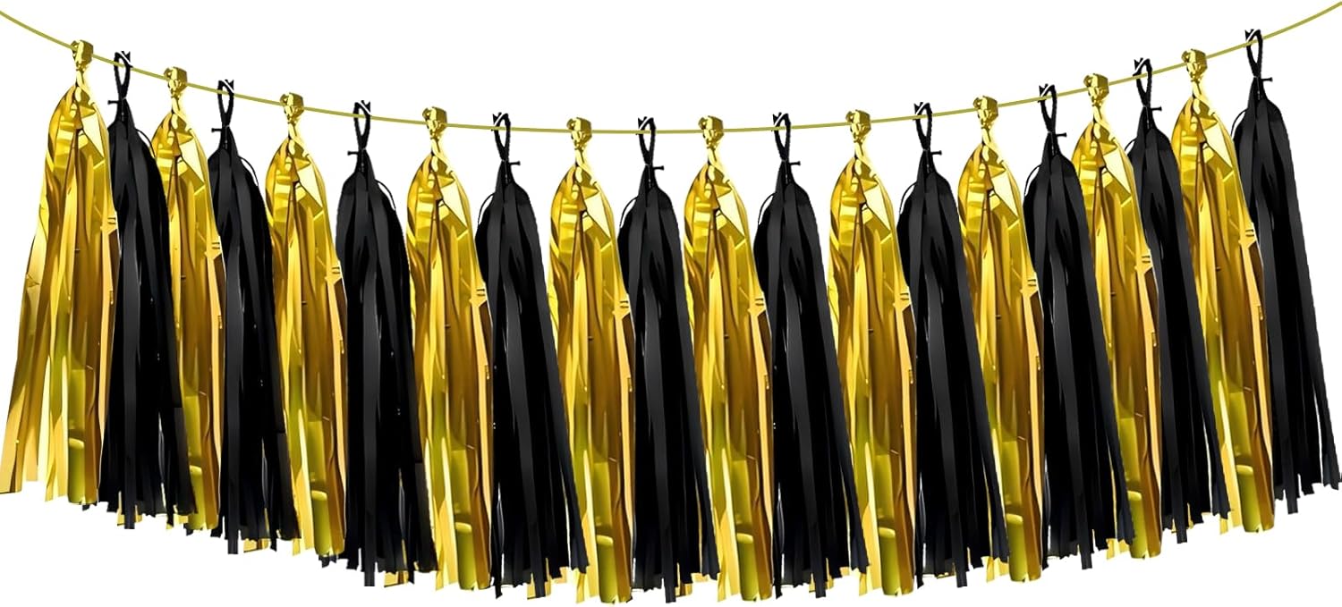 ZOOYOO Shiny Tassel Garland Tissue Paper Tassel Banner Table Decor,DIY Kits for Birthday,Wedding,Bridal Shower,Bachelorette,Graduation,Anniversary,New Year Party Decorations,Pack of 20(Black Gold)
