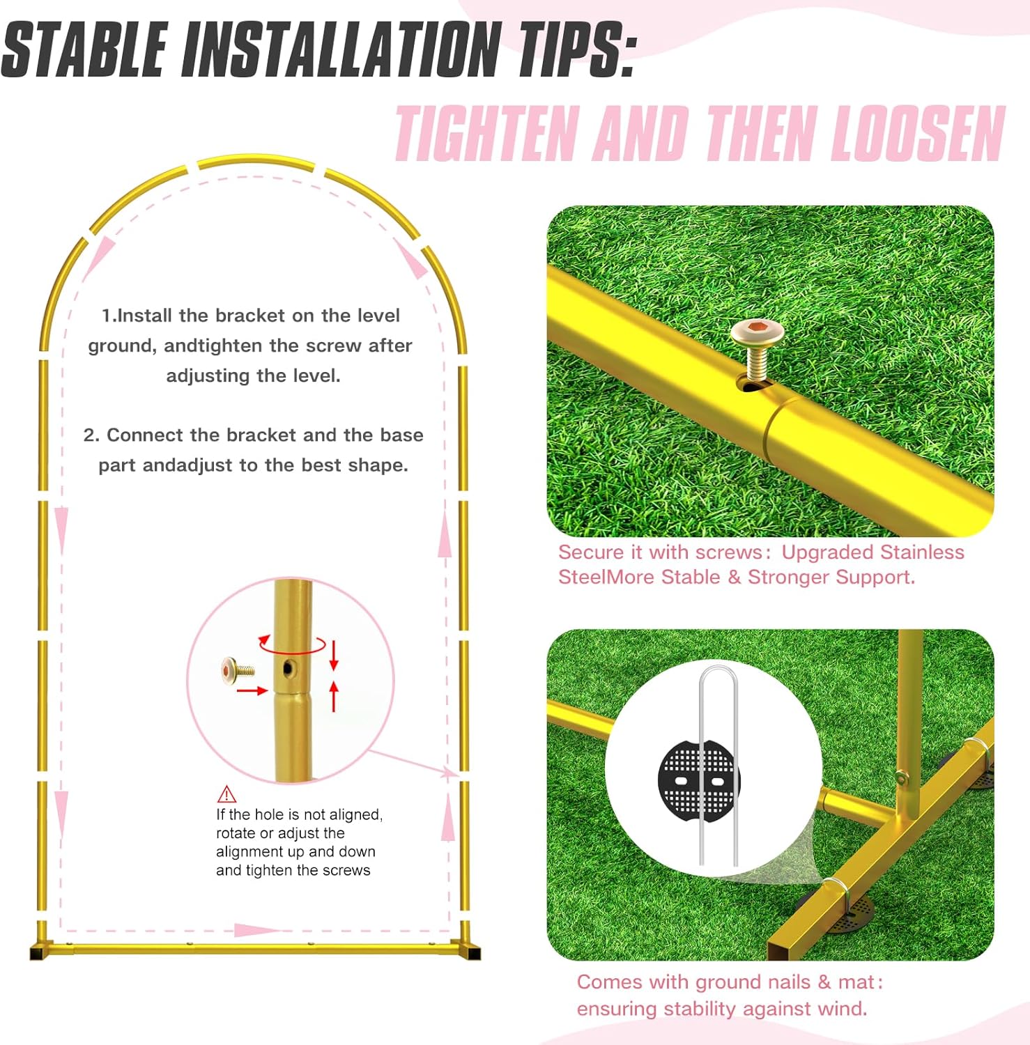 - 【Versatile Metal Arch Kit】: Set of 3 gold metal arch stands (7.2FT/6.6FT/6FT), 4 transparent balloon boxes, 12 arc floor nails, 12 floor mats and 3 storage bags. Ideal for both indoor and garden outdoor celebration decoration ,providing the perfect size for any event.Metal arches frame create a richly layered dynamic background for you