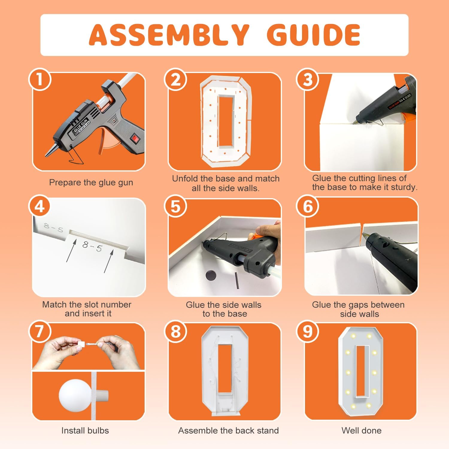 - EASY TO ASSEMBLE: The package includes pre-cut foam boards, light strings and instructions. Each foam board has slots and is numbered, so you can match them according to the 2 same numbers. All you need to do is to prepare a hot glue gun and 3 AA batteries, follow the step-by-step instructions or online video for a hassle-free assembly. Decorate the party with your kids or friends and enjoy the DIY fun. (Note: Glue gun, glue and batteries are not included)