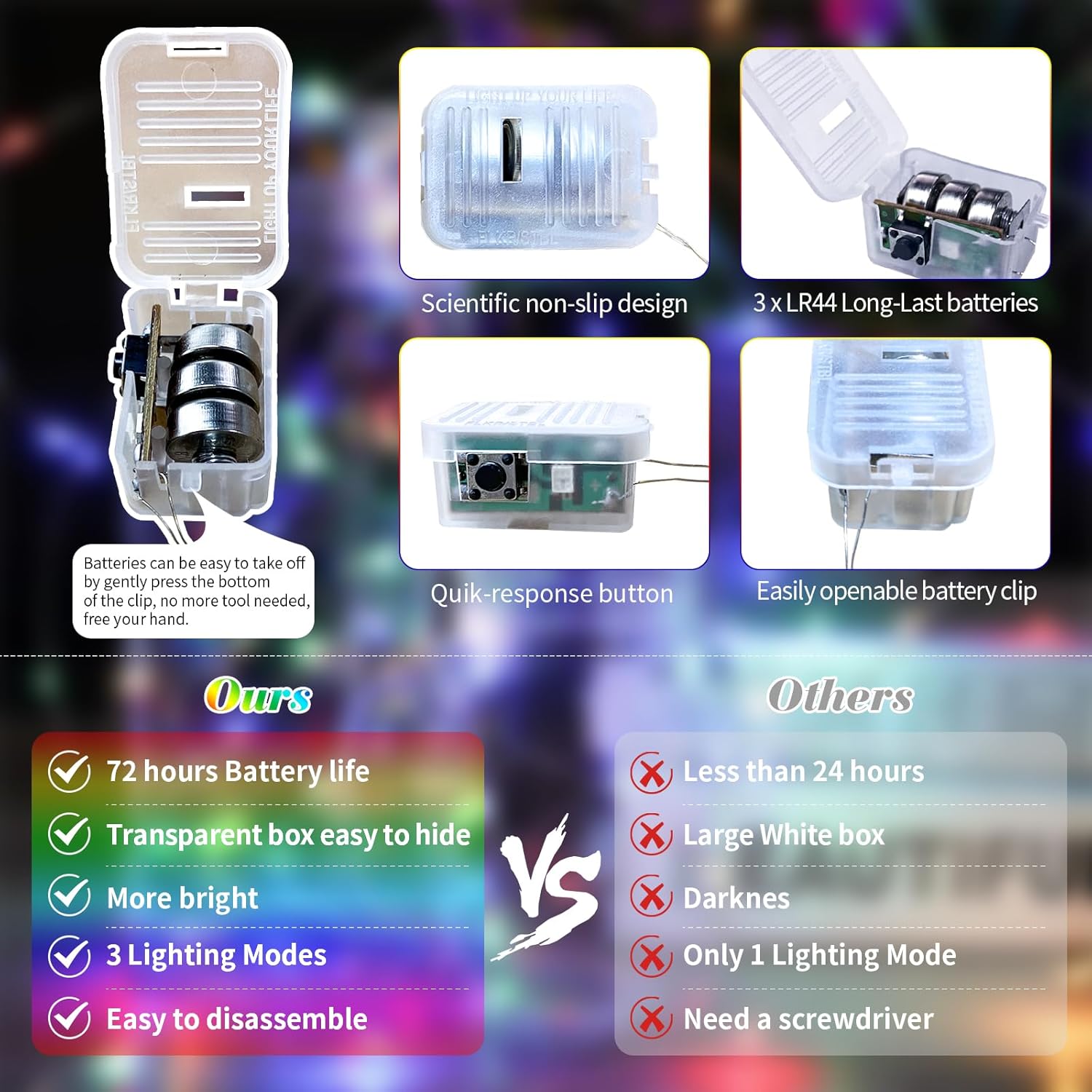 • UPGRADED DESIGH AND EASY TO REPLACE: The fairy lights' newest clear and small battery box is 0.78*1.36 inches in size, very easy to hide into all your DIY projects. The upgraded battery pack has scientific non-slip design on both sides, which makes it feel comfortable and easy to catch. Batteries are also very easy to take off, no more screwdriver needed, just gently press the bottom of the clip to open, free your hand