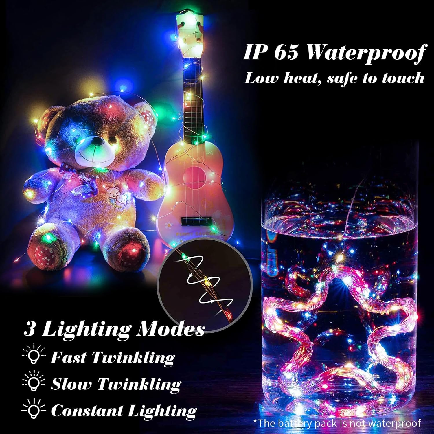 • IP65 WATERPROOF AND INDIVIDUALLY WRAP: The battery fairy lights are waterproof can be used for Indoor/Outdoor. (the battery pack is not waterproof) safe to the touch. Made of soft bendable wire so you can easily bend into any shape or wrapped it on anything such as Christmas trees, wine bottle, pumpkins, guirlande lumineuse interieure, potted landscape etc.Each light is individually packaged, say goodbye to cable tangles and bring more happiness and satisfaction to your family and friends