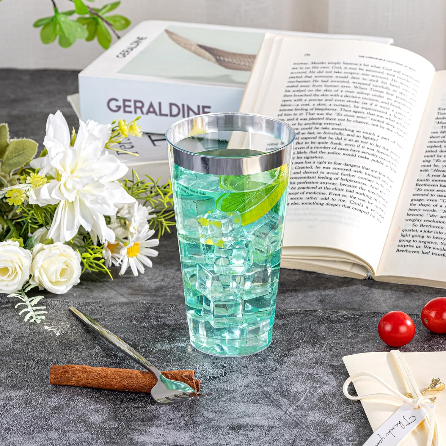 I00000 16 oz Silver Plastic Cups, 50 Pack Clear Plastic Cups,Silver Rimmed Disposable Cup, Heavy-duty Disposable Tumblers Perfect for Party, Holiday, Wedding & Birthday