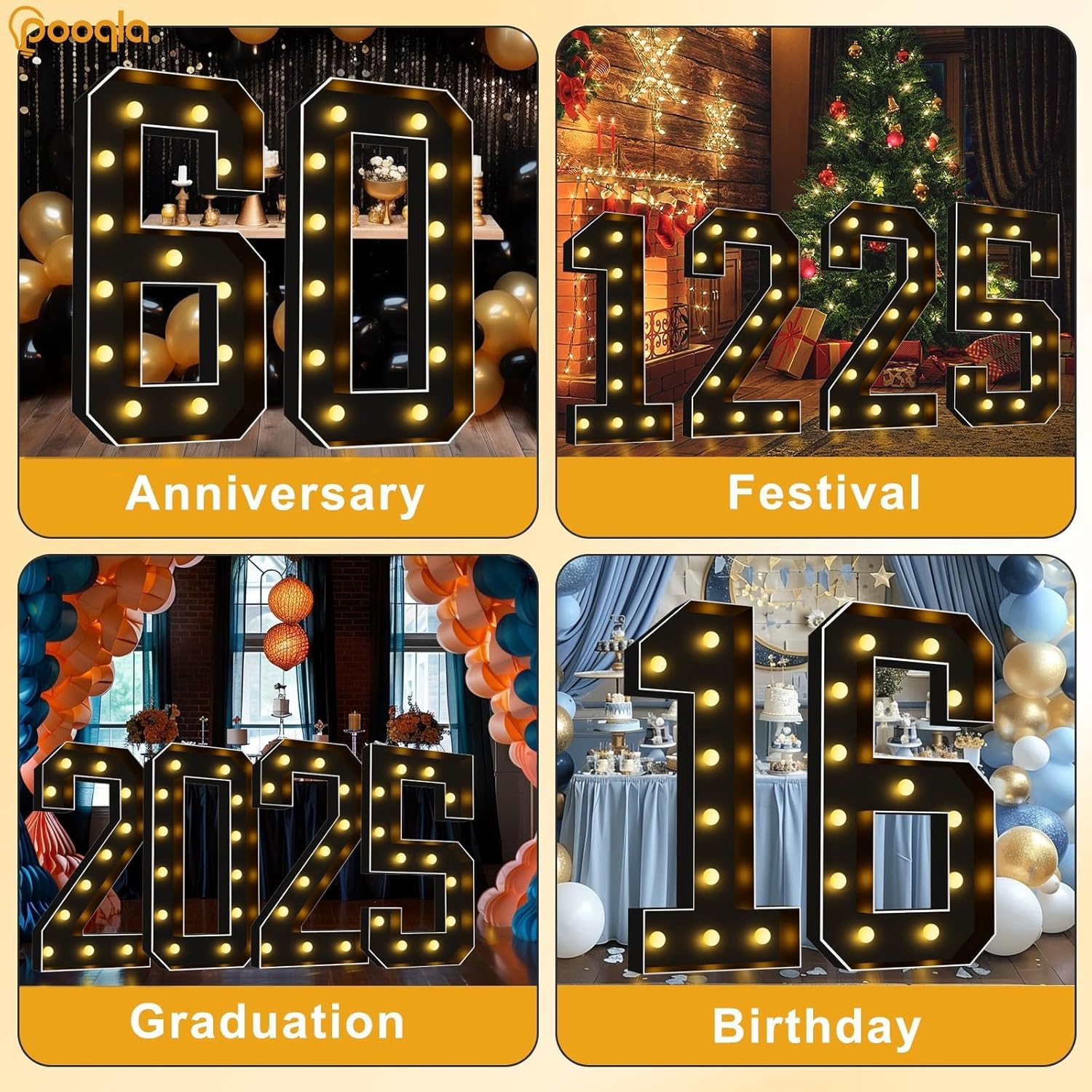- Giant 4 Feet Marquee Numbers with LED Lights: Mosaic numbers designed with warm white LED string lights. Giant LED numbers can be powered by 3 AA batteries (Not Included) or USB, convenient for black party decoration