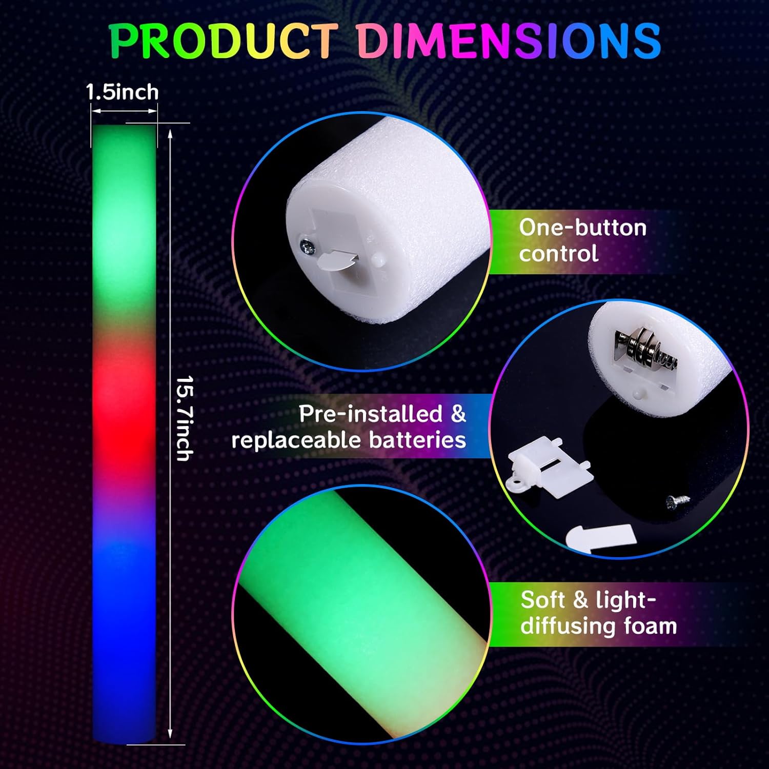 - 12-Pack Multicolor LED Foam Glow Sticks – Bright & Vibrant Party Lights: Each 16 x 1.6-inch glow stick features vibrant red, green, and blue LED lights, creating a stunning neon effect that catches everyone’s attention. Perfect for concerts, raves, weddings, birthdays, festivals, and night events, these light-up wands add energy and fun to any celebration!