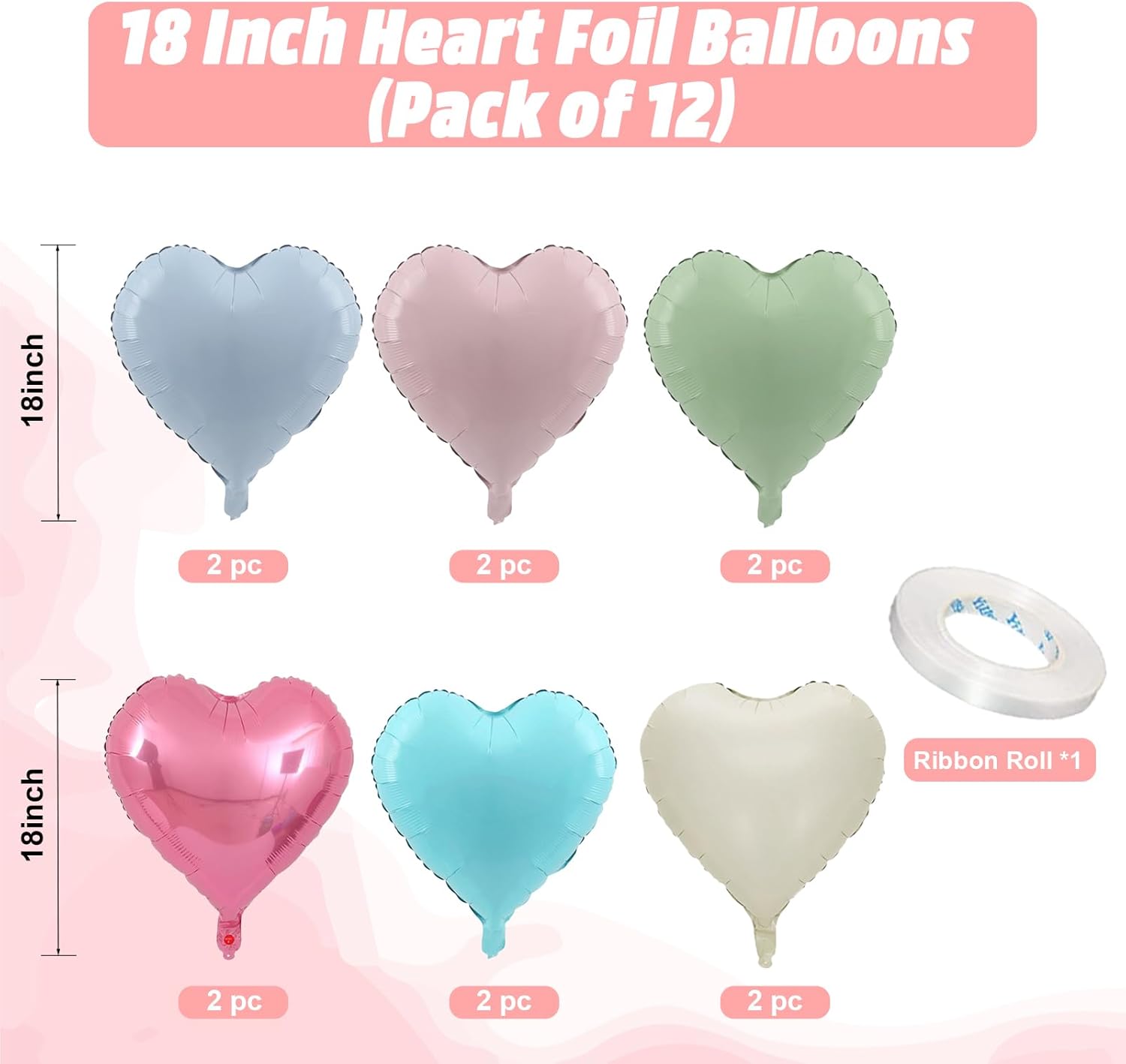 - Charming Pastel Colorful Heart Balloons: Elevate your celebration with our set of 12 heart-shaped rainbow balloons, each measuring 18 inches. Accompanied by a ribbon, these balloons are ideal for creating a festive and loving atmosphere at any special event.