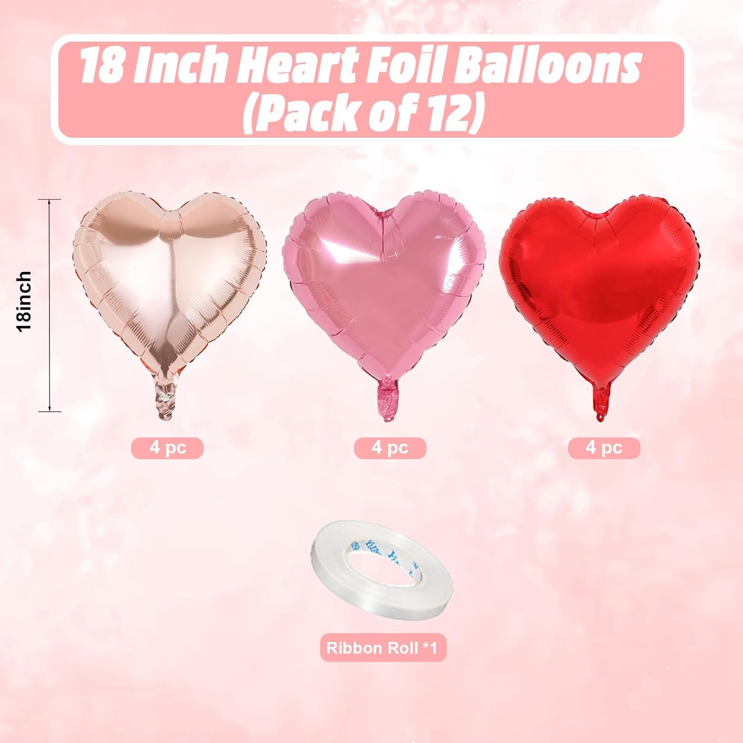 • Charming Rose Gold Heart Balloons: Elevate your celebration with our set of 12 heart-shaped red pink rose gold balloons, each measuring 18 inches. Accompanied by a ribbon, these balloons are ideal for creating a festive and loving atmosphere at any special event.