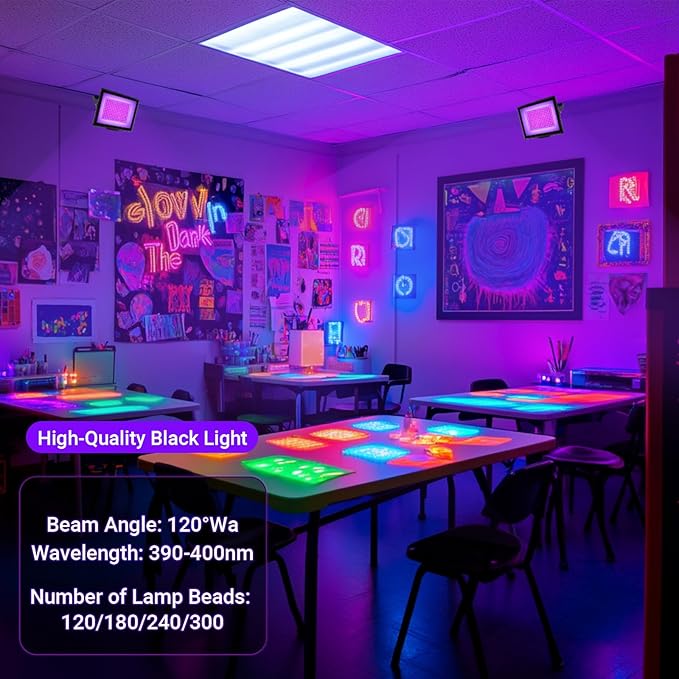 - POWERFUL BLACK LIGHTS: 300W black light with 300 lamp beads; 120 degree wide beam angle, wavelength 390nm~400nm; ideal for making neon-colored objects glow in the dark; perfect for creating vibrant effects in black light parties; black lights for halloween