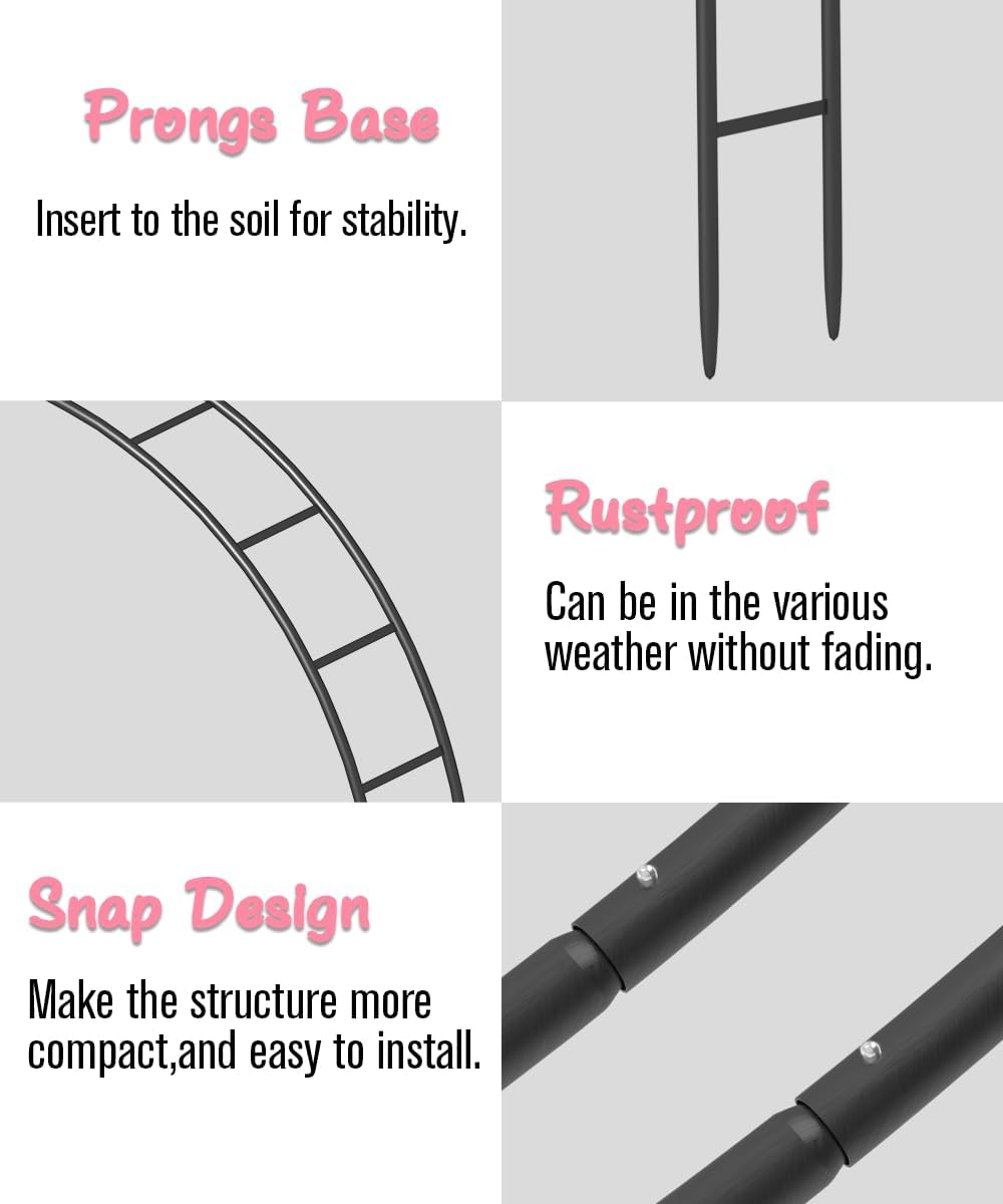 - Double-Tubes Construction: This garden arch features a robust double-tube structure with a sturdy base, ensuring exceptional stability and balance. The snap design contributes to a more compact and durable construction, making it suitable for both indoor and outdoor applications.