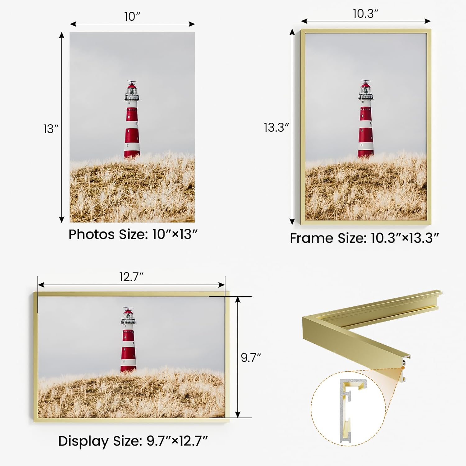 - 【10x13 Picture Frame】This 10x13 poster frame,perfect for 10x13 inch photos,certificates,and documents.10x13 inches refers to the matching photo and item size, and the display size will be slightly smaller than this size.