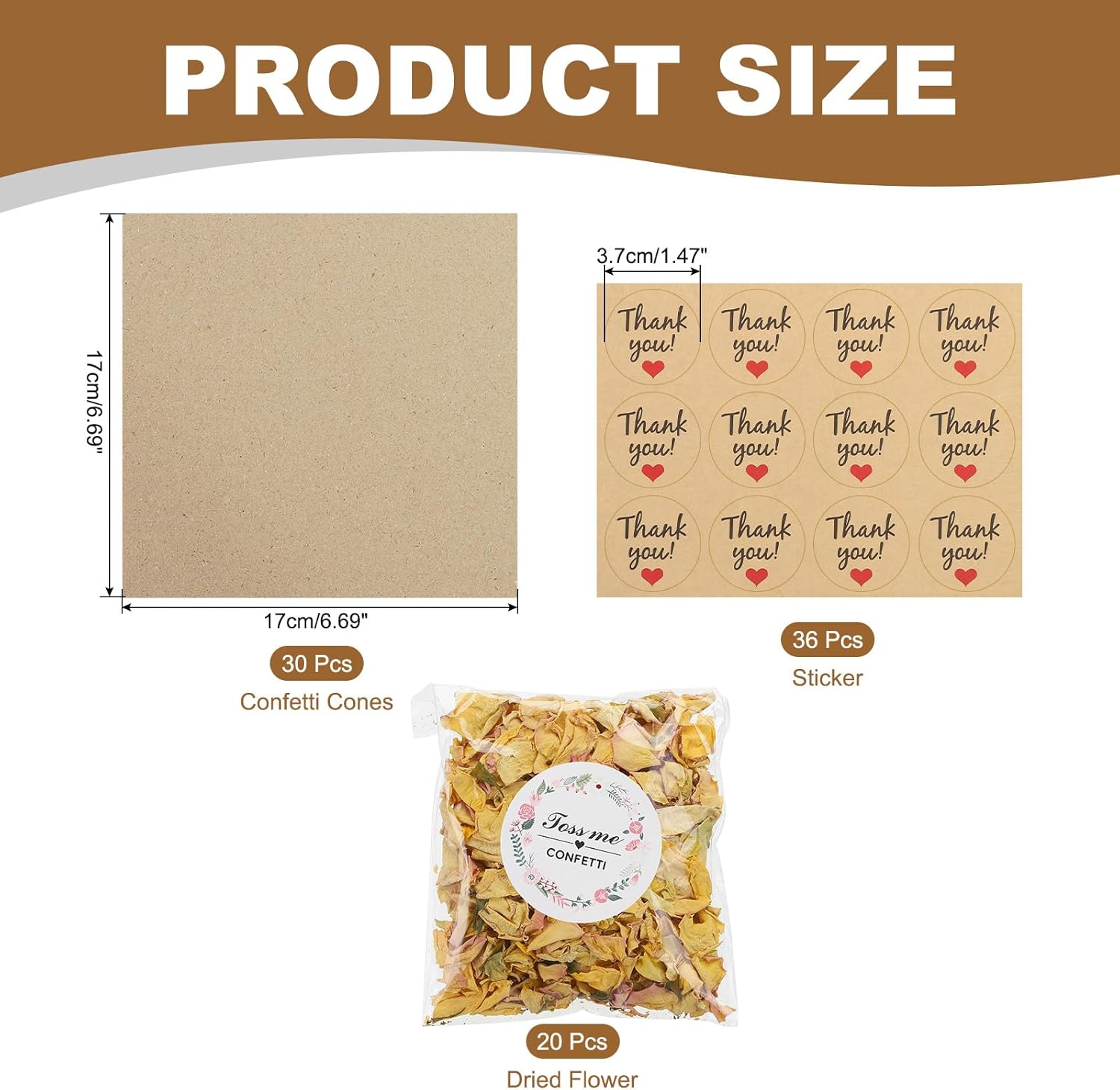 - Material: Paper; Color: Light Yellow/Pink; Paper Cone Size: 17 x 17 cm / 6.69 x 6.69 inch (LxW); Sticker Diameter: 3.7 cm / 1.47 inch; Dried Flower Weight: 160 g / 3.4 qt / 5.75 oz; Package List: 30 Pcs x Confetti Cones, 20 Pcs x Dried Flower, 36 Pcs x Sticker