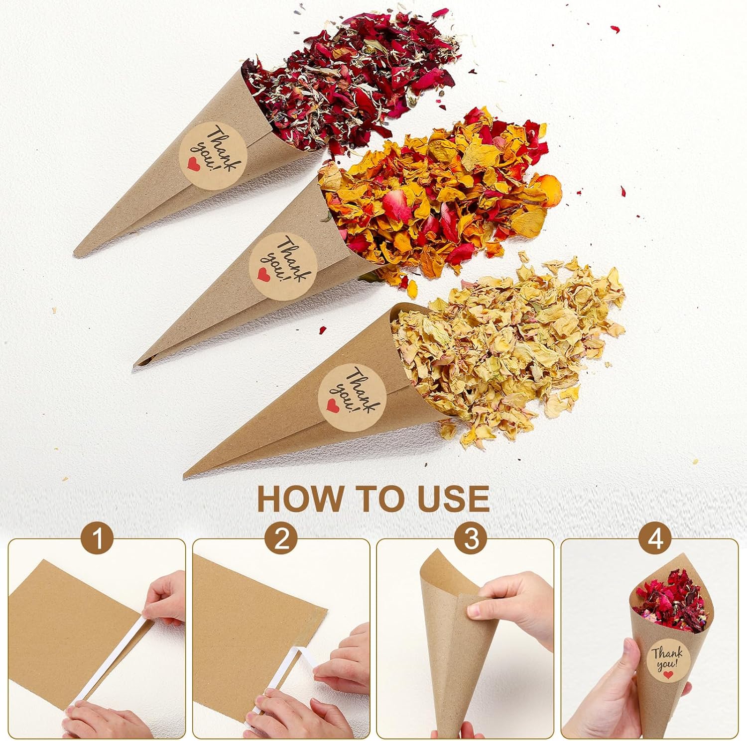 - Durable Material - The confetti cones and paper cone boxes are made of paper material, have no odor, are comfortable to touch, light quality, and do not take up extra space. The dried petals are made of natural rose mix, you can smell the fragrance of different natural rose mixes, giving you a romantic experience.
