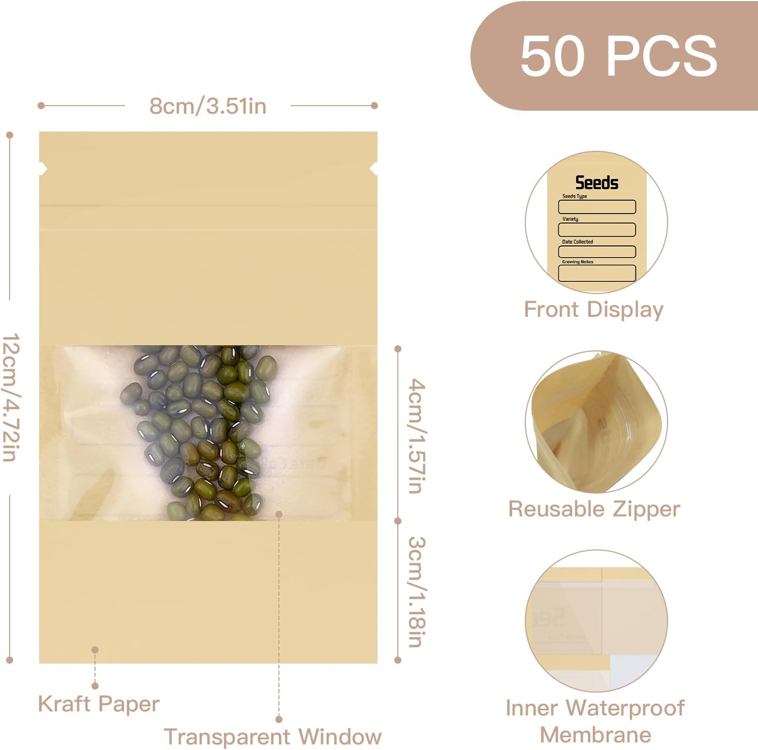 - REUSABLE ENVELOPES: Package includes 50 reusable seed envelopes which come with convenient writing spaces to record essential information like plant variety, date collected, and special care notes. The envelope measures 3.15'' x 4.72'', with a zippered self-sealing strip for convenience resealing. Each envelope has a transparent window that allows you to quickly identify its contents.