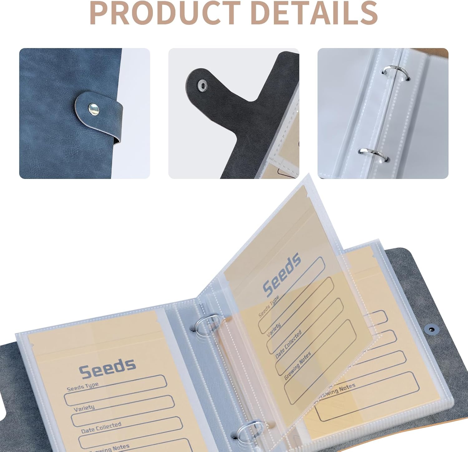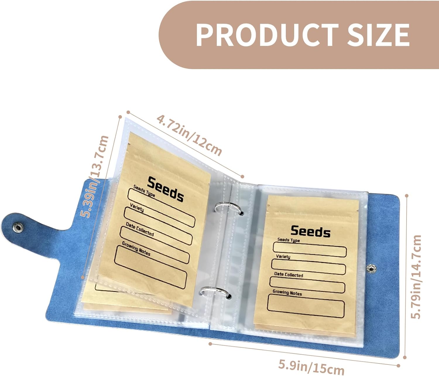 - STYLISH BINDER: The binder has a simple style imitation leather cover measures 5.79'' x 5.90'' , each storage slot measures 3.54'' x 5.12'' , compatible with most standard seed packets, can hold up to 50 seed bags.This compact size makes it convenient to carry and store.