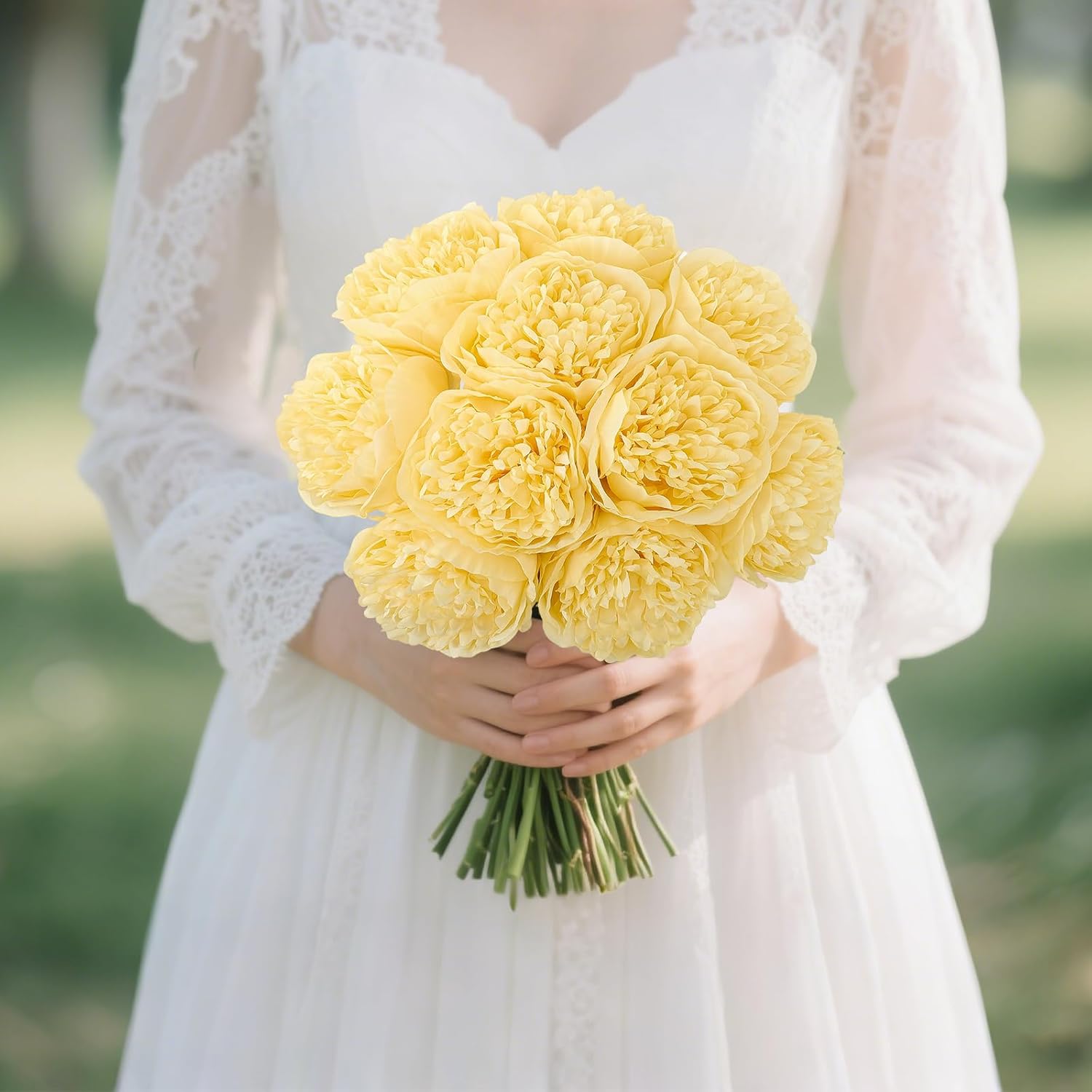 U'Artlines 10 Heads Artificial Peony Silk Flower Leaf Home Office Wedding Party Festival Bar Decor (Yellow)